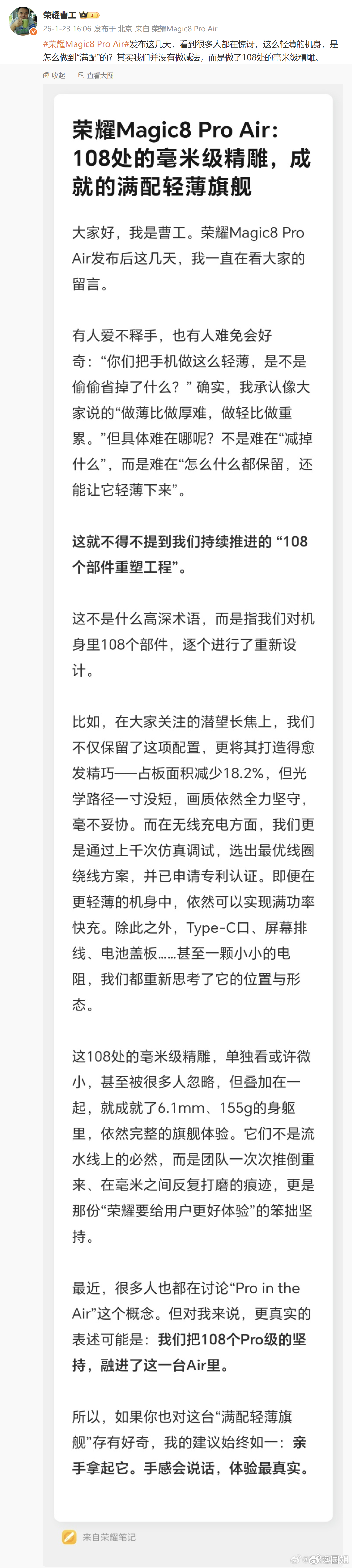 #荣耀工程师称做Air不代表阉割配置#戳中痛点了,用户需要什么荣耀就造什么!背后不计成本地做了技术投入,没想到定制了多达108个部件这波Pro级堆料当真够狠,这才是Air机型该有的样子,轻薄手感+旗舰体验谁都喜欢#荣耀Magic8 Pro Air#