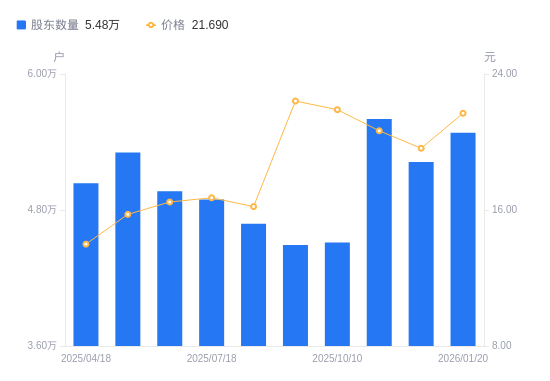 日期A股户数(户)流通A股户均持股数(股)户均持股市值(万元)2026-01-20548066730.3414.602025-12-31522457060.2513.862025-11-28560296583.4313.602025-10-10451278173.8817.902025-09-30449058214.2918.412025-07-31467827884.7212.772025-07-18489337538.1212.602025-06-30496607427.7612.232025-06-10530776949.5810.942025-04-18503607324.5210.25