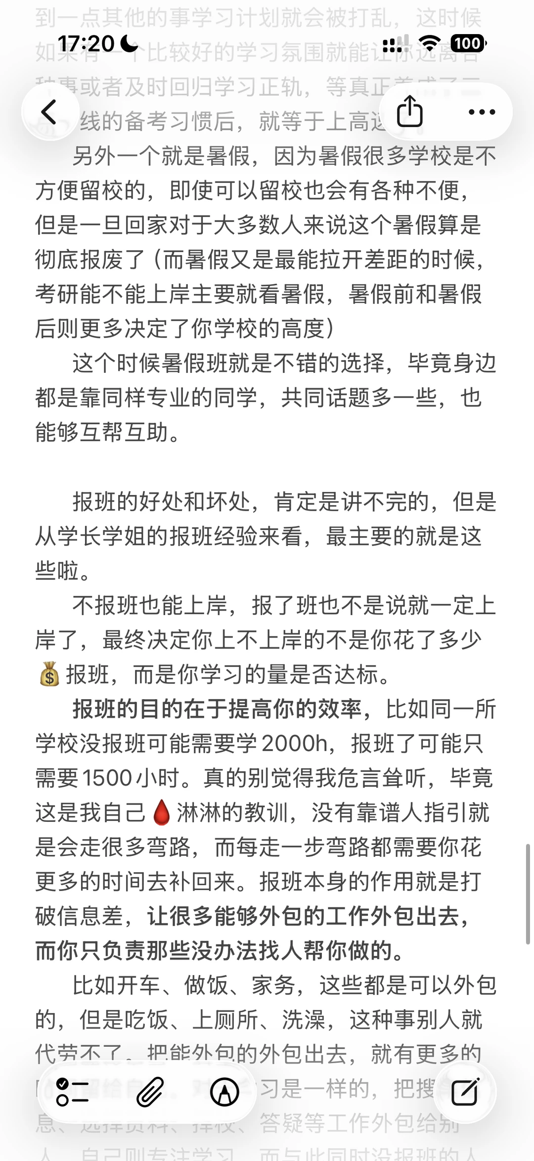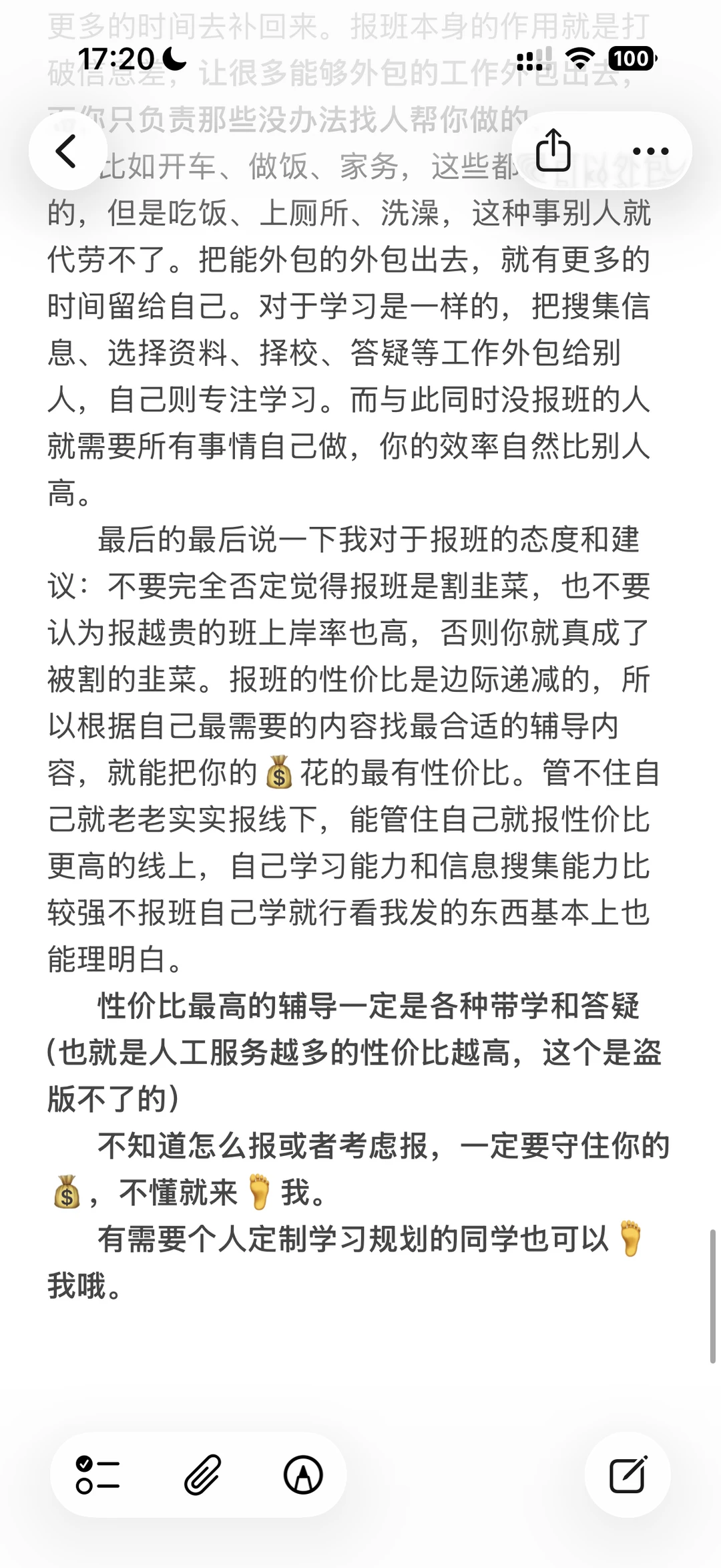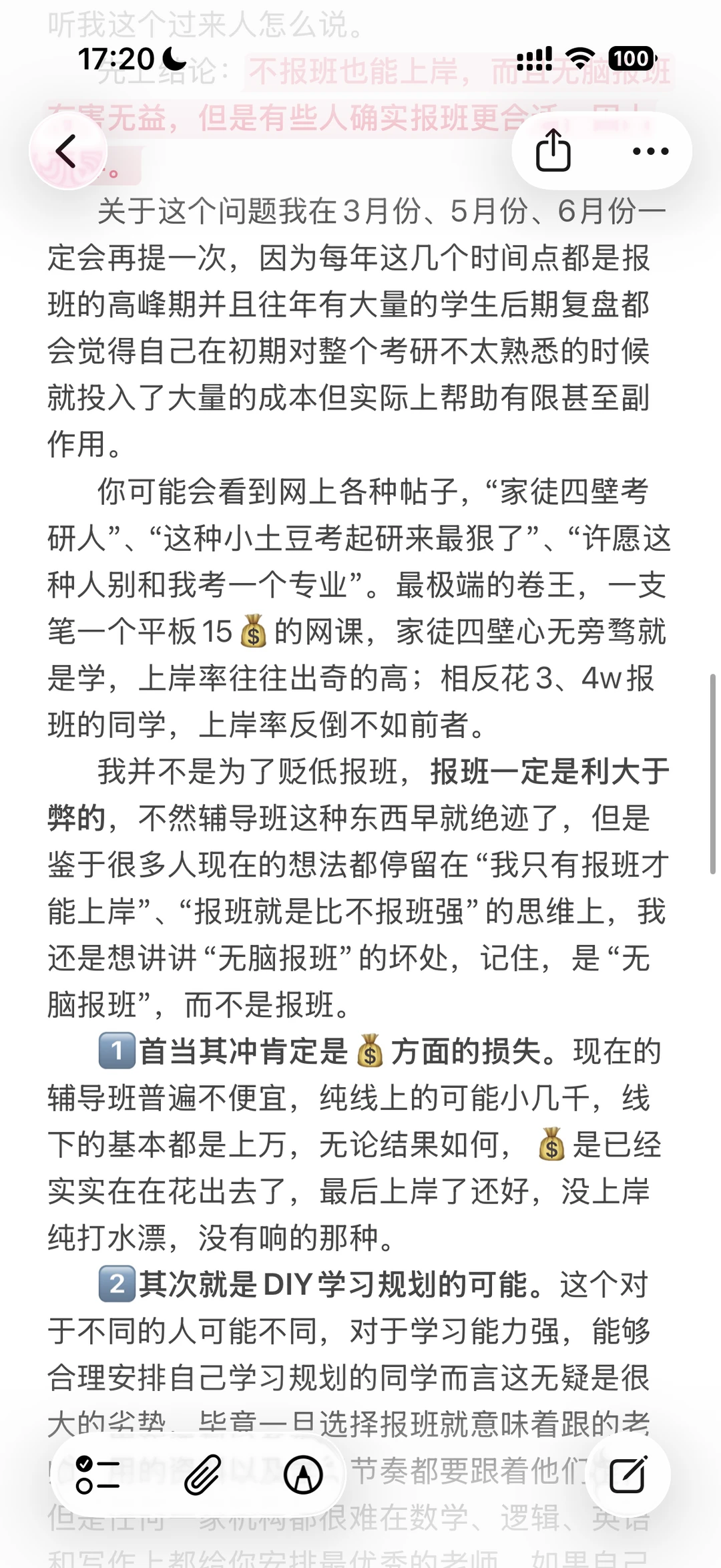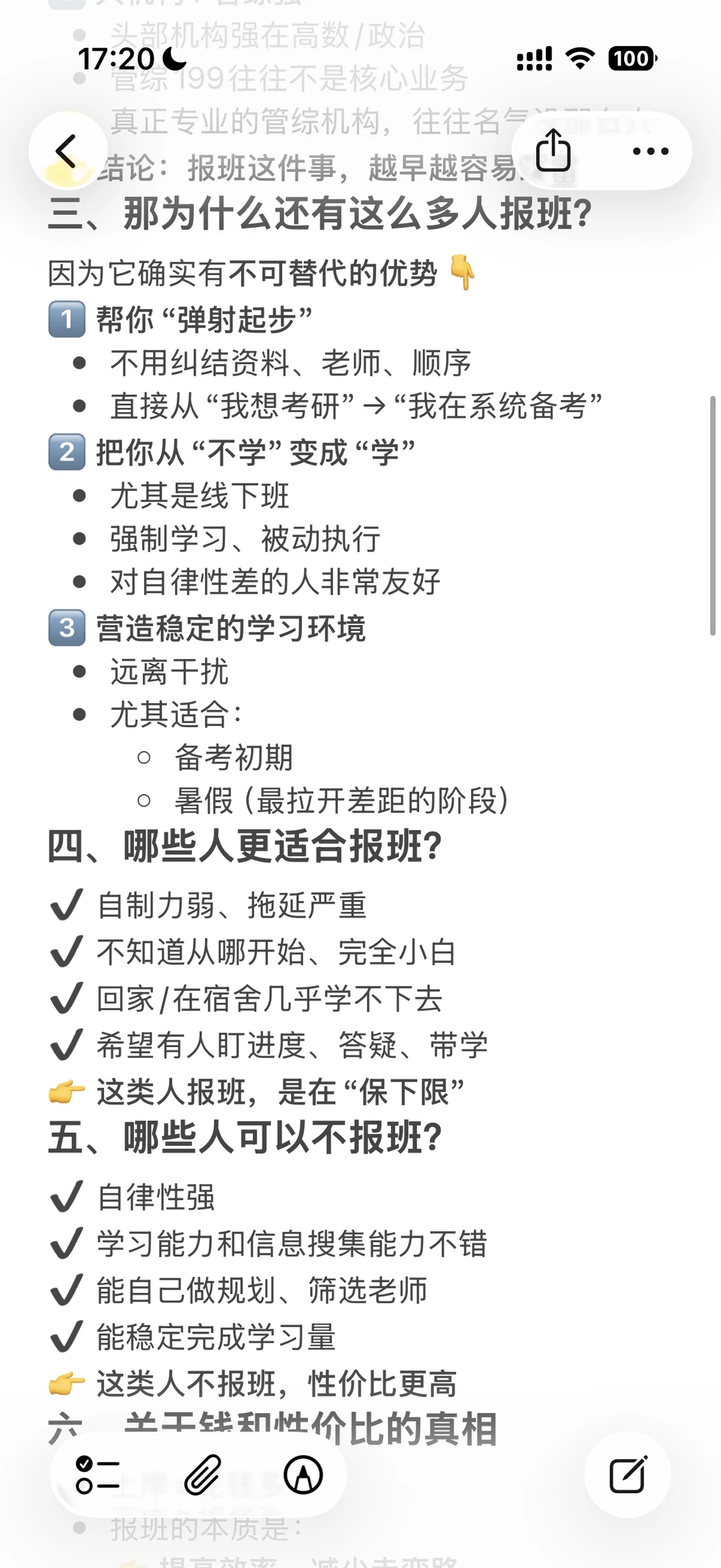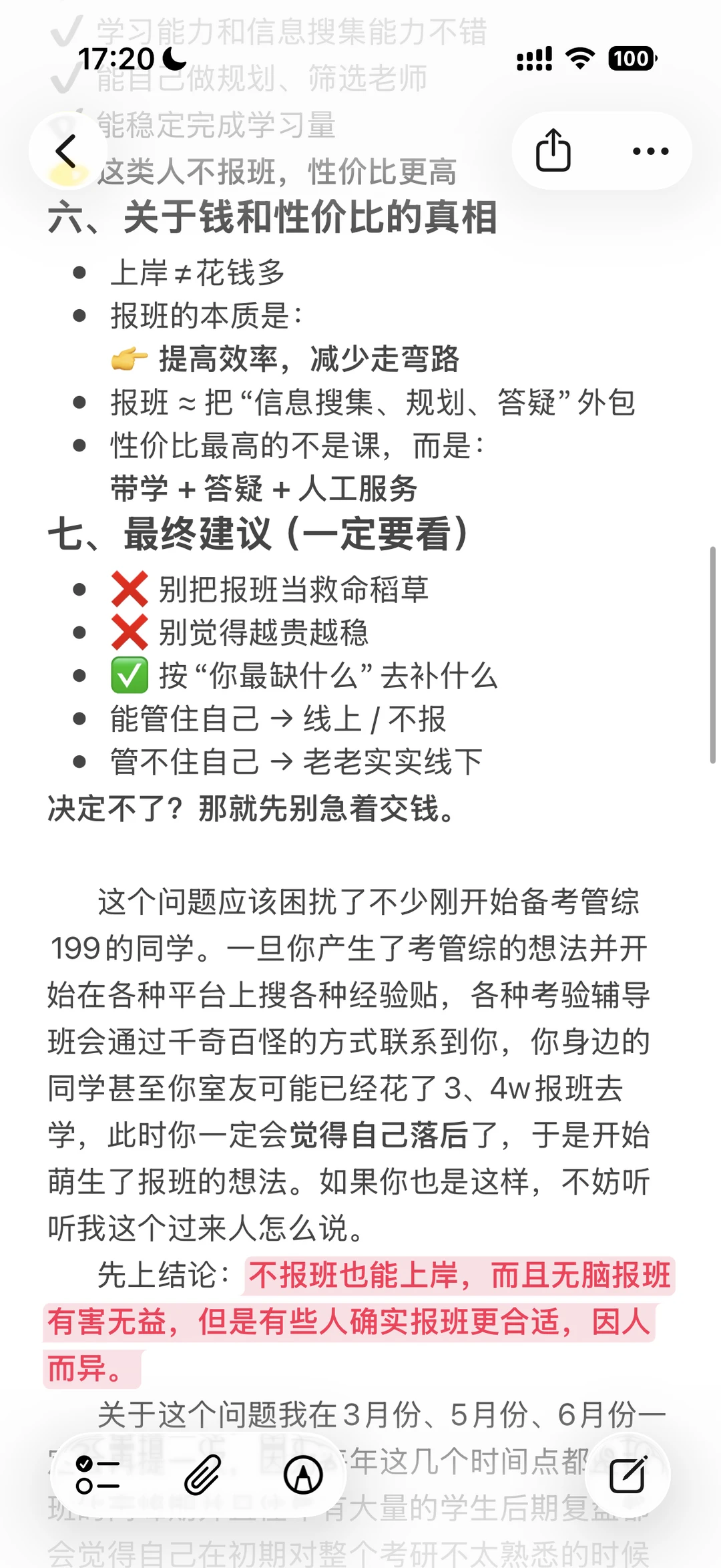 我对于报班的态度和建议:不要完全否定觉得报班是割韭菜,也不要认为报越贵的班上岸率也高,否则你就真成了被割的韭菜。报班的性价比是边际递减的,所以根据自己最需要的内容找最合适的辅导内容,就能把你的💰花的最有性价比。管不住自己就老老实实报线下,能管住自己就报性价比更高的线上,自己学习能力和信息搜集能力比较强不报班自己学就行看我发的东西基本上也能理明白。