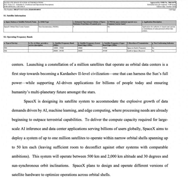 1月30日,SpaceX向美国联邦通信委员会提交了申请,将该项目描述为“一个拥有前所未有的计算能力的卫星星座,可为先进的人工智能(AI)模型及其相关应用提供支持”。