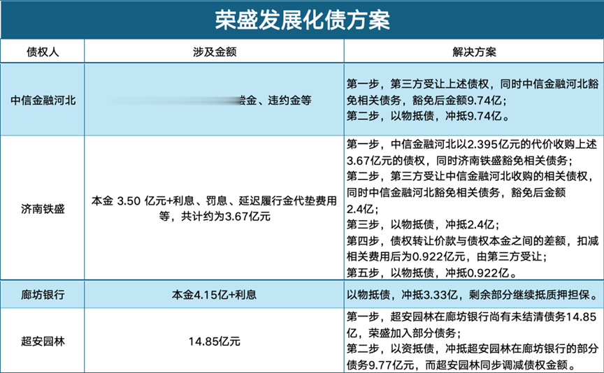 另一边,与济南铁盛的存续3.67亿元债务,荣盛则玩起了拆分术。先让中信金融河北以2.395亿元的代价收购上述债权并豁免部分,豁免后,债务瞬间“缩水”至2.4亿元,而这部分债务,同样由第三方接盘,继续以实物资产冲抵。
