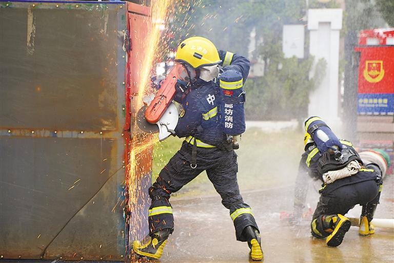 廊坊消防组织开展火灾破拆技能训练。