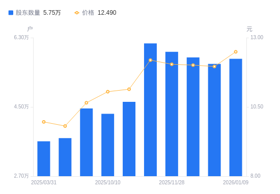 日期A股户数(户)流通A股户均持股数(股)户均持股市值(万元)2025-12-105786113559.9016.292025-11-285933713222.6015.922025-11-206151712754.0315.552025-10-314631916938.8318.872025-10-104321118149.6820.062025-09-304460317583.2518.732025-06-303688219339.9318.972025-03-313606619712.7719.632024-12-313632819570.6016.222024-09-304289716562.9310.50