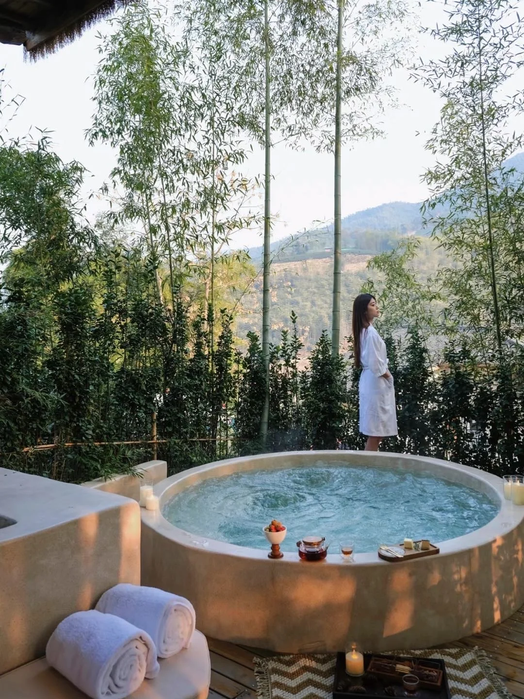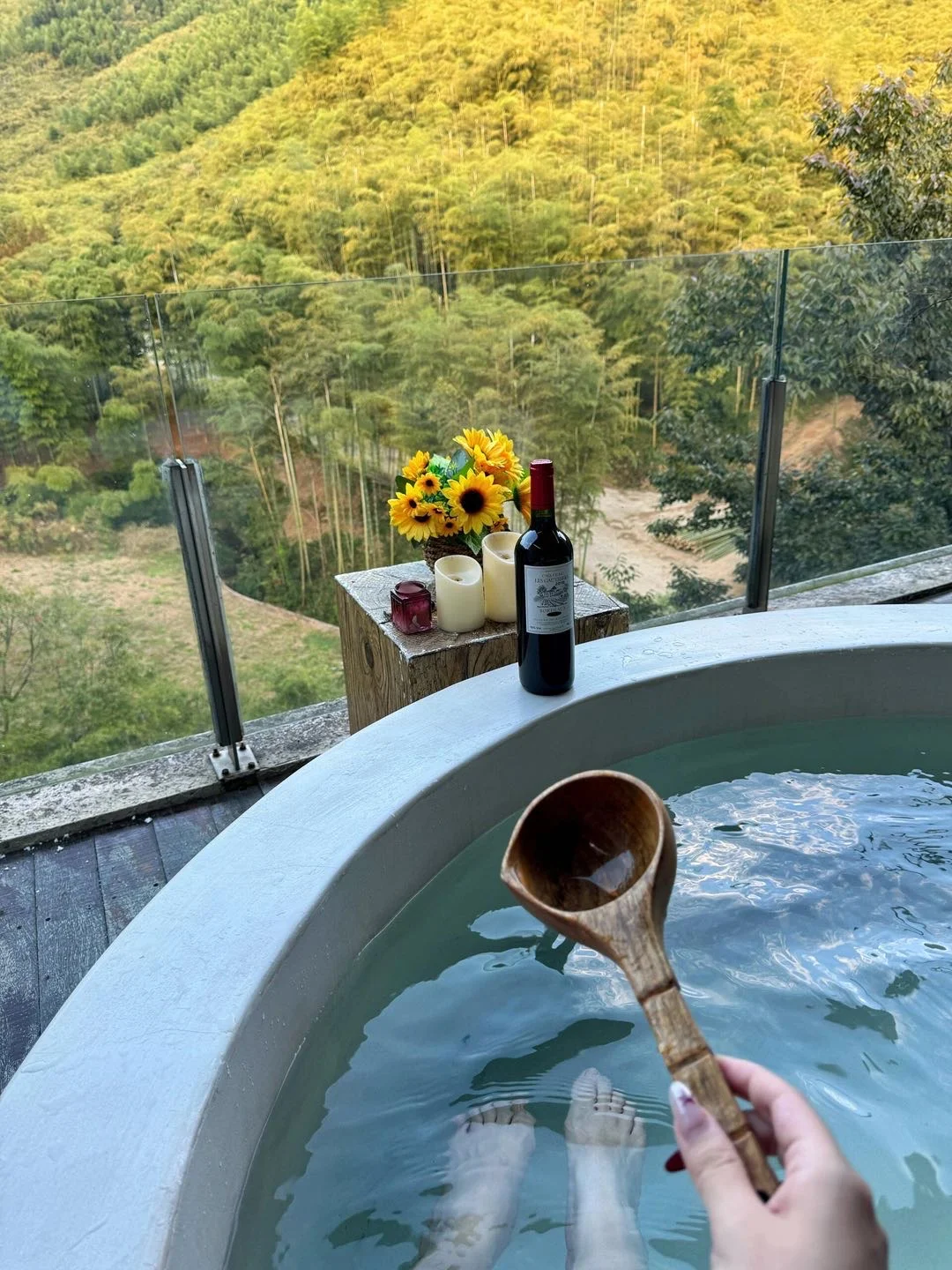 院子里独立的温泉‼️保证了泡汤♨️的私密性,还是含氡温泉水💦泡完整个人都变得滑滑的,好舒适解压~