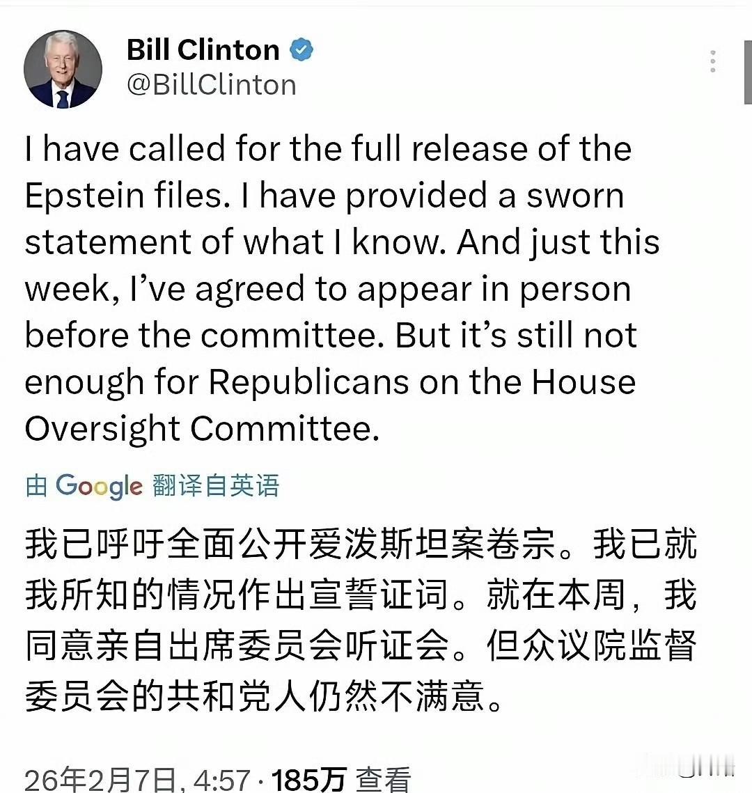 克林顿最新发声的大概意思:川普你要不怕事大,我就抱着你同归于尽。 克林顿之所以敢这么干,要么确认川普的事儿更大,要么确认民主党完全能够掌控听证会。前者可能性大:川普在档案中出现的频率,包括文字视频和照片,都比克林顿高一个量级。