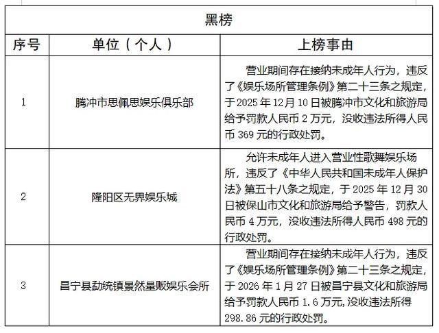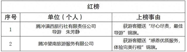 为认真贯彻落实《云南省人民政府关于印发云南省旅游市场秩序整治工作措施的通知》(云政发〔2017〕19号)精神,根据《保山市文化和旅游“红黑榜”制度》,决定将诚信守法的涉文、涉旅企业和有关从业人员纳入红榜,予以通报表扬;将违反文化、旅游相关法律法规,受到行政处罚的涉文、涉旅企业和有关从业人员纳入黑榜,予以通报警戒。现将名单通告如下,接受社会监督。
