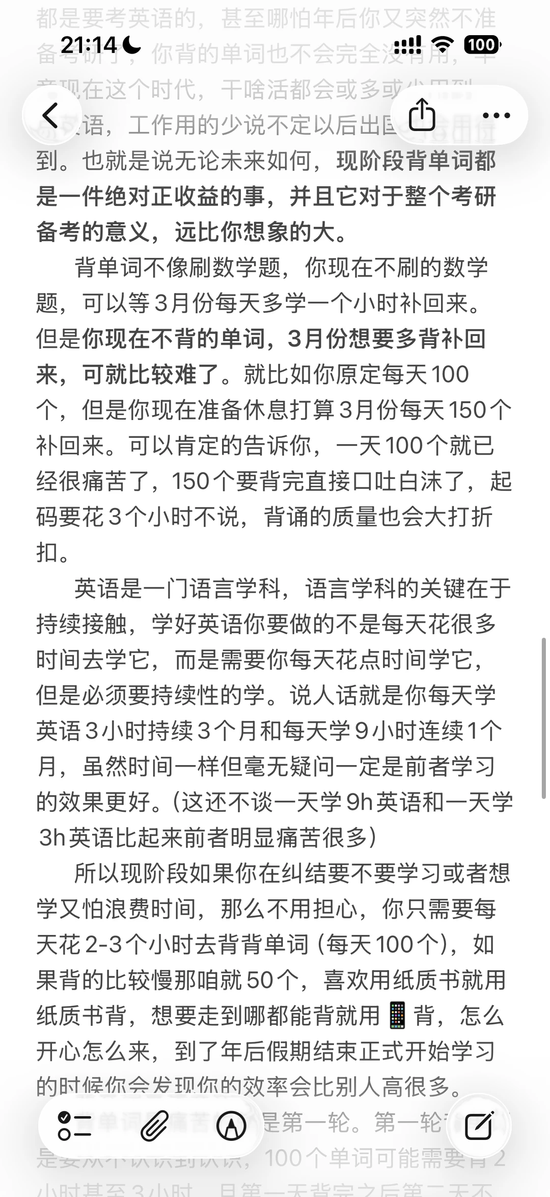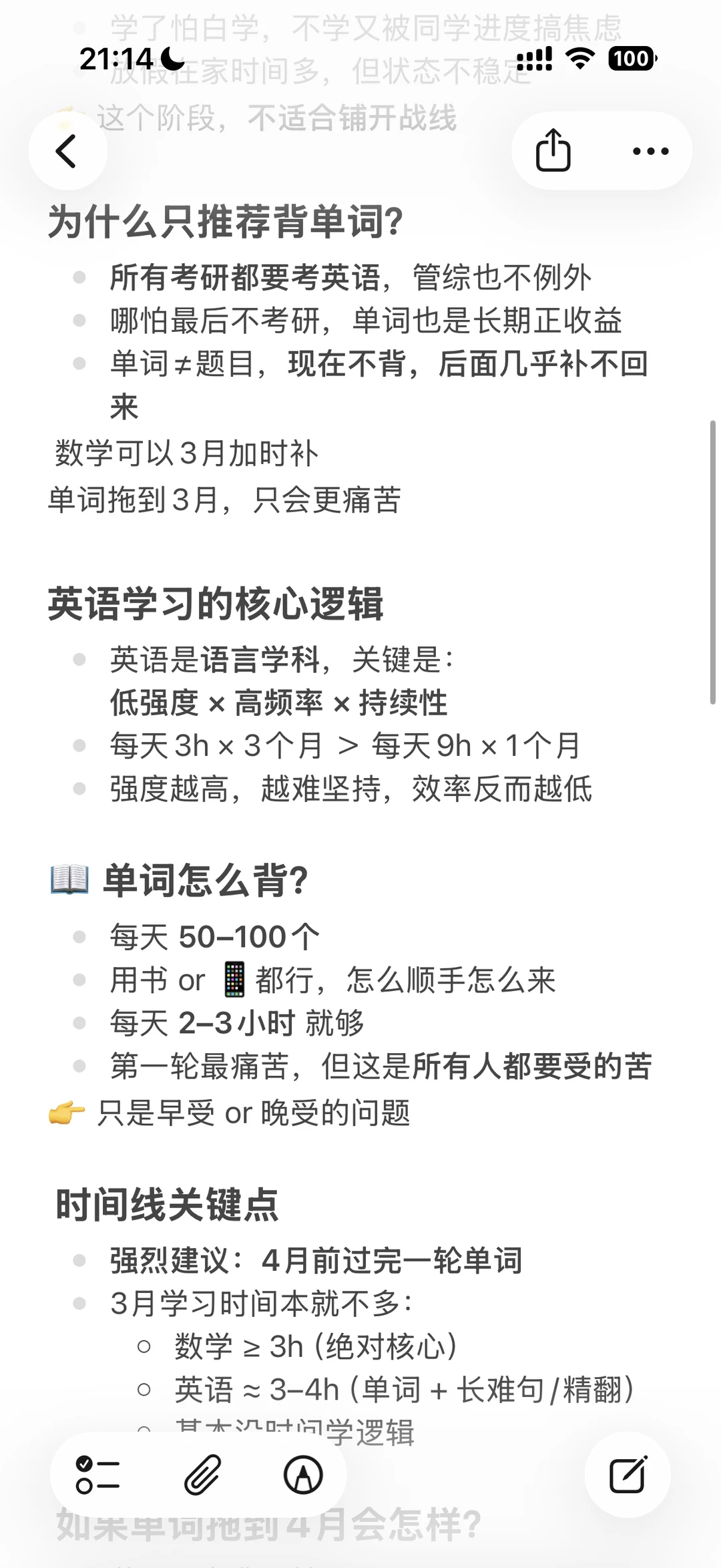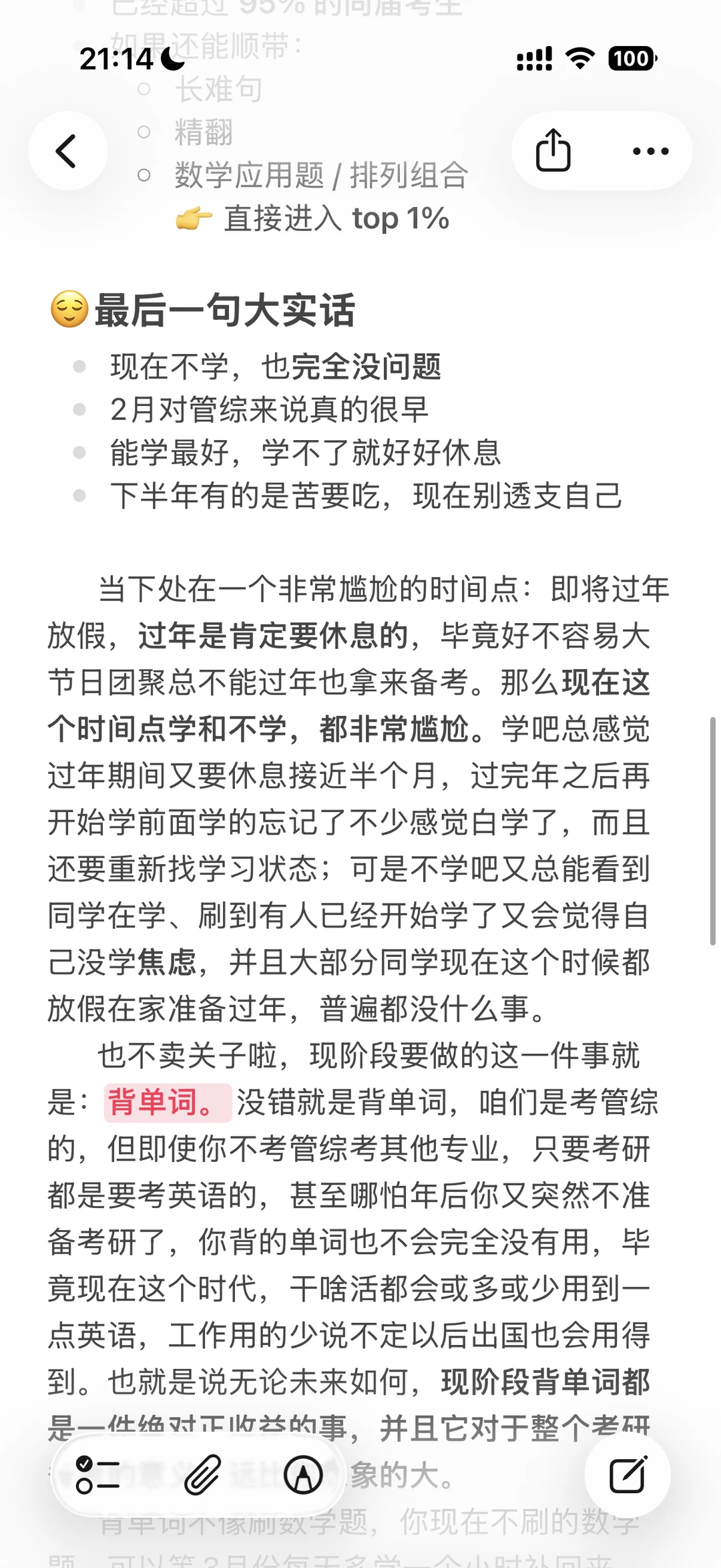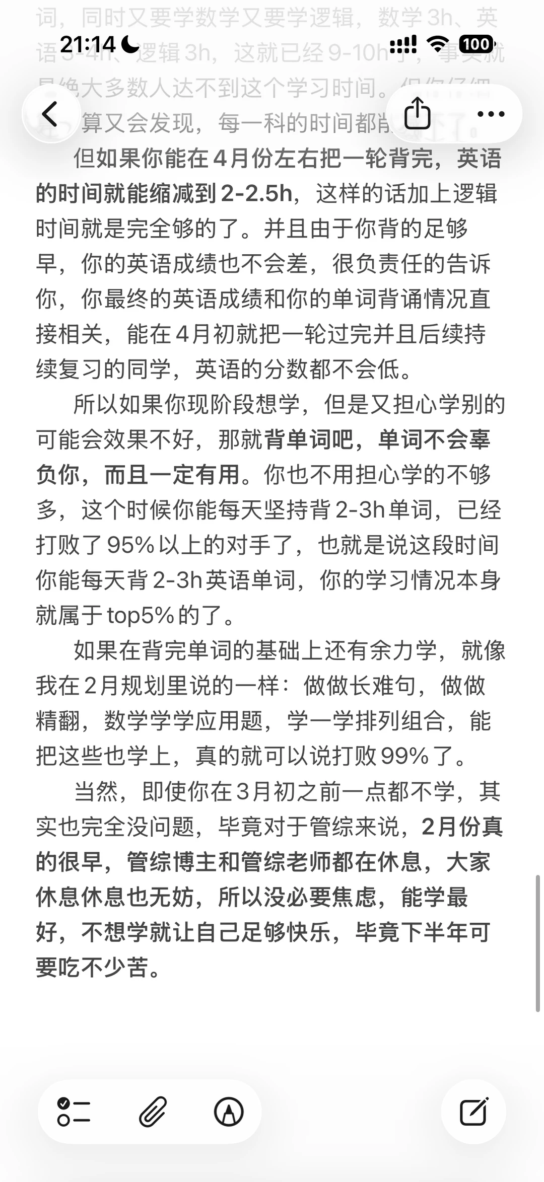 学也不是,不学也不是。 一想到过年要休息半个月,学了又怕白学。 但不学,刷到别人已经开始备考,又开始焦虑。 如果你正处在这个阶段,这篇就是给你写的。 先说结论,不卖关子 👉 现在到过年前,只做一件事:背单词。 不刷题。 不系统学数学。 不碰逻辑。 只背单词。 一句话结论: 现在到过年前,这段“学也尴尬、不学也焦虑”的时间,只需要专心 背单词。