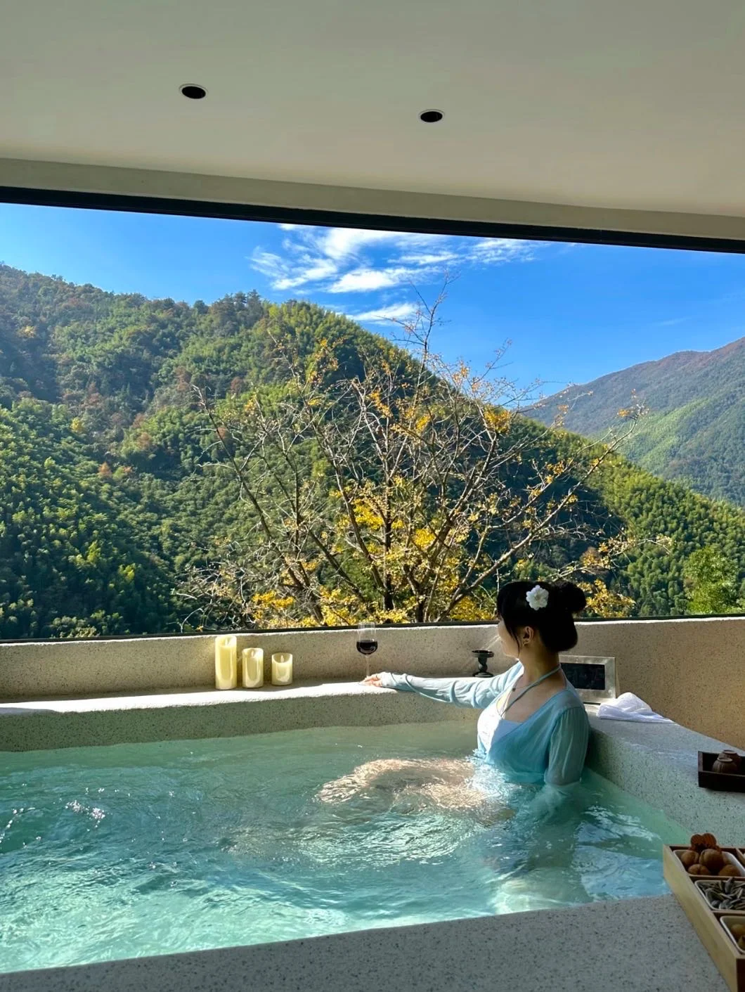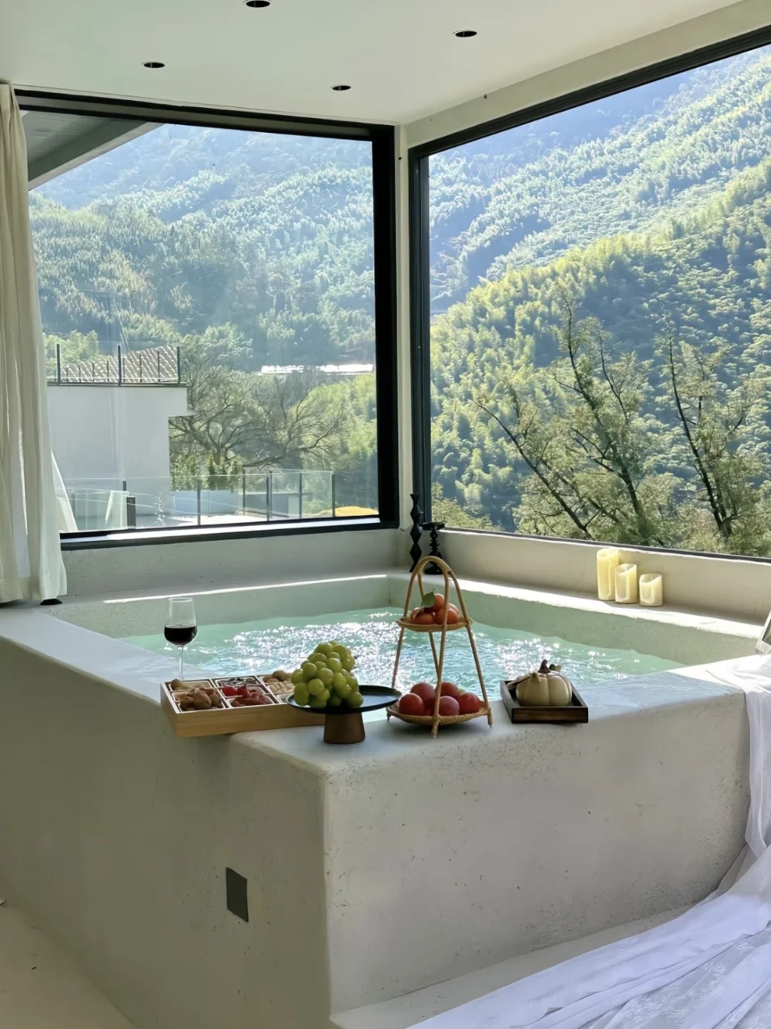 ✨山野私汤温泉♨️配上水果🍇蜡烛🕯️,拍照真的好出片!泉水是纯天然的温泉水,泡完皮肤滑滑的~