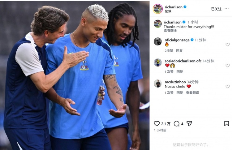直播吧2月12日讯热刺主帅弗兰克下课,里沙利松社媒与他告别。