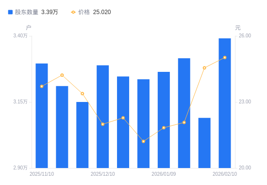 日期A股户数(户)流通A股户均持股数(股)户均持股市值(万元)2026-02-10339095640.8714.112026-01-30309006190.1715.202026-01-20331555769.1512.732026-01-09326385860.5412.792025-12-31323595911.0712.542025-12-19324655891.7713.132025-12-10328885815.9912.792025-11-28315026071.8814.202025-11-20321005958.7614.432025-11-10329555804.1713.76