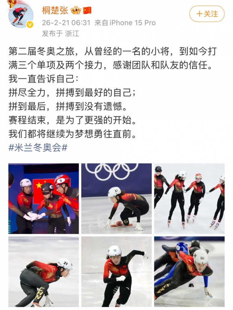 赛后张楚桐更新社媒总结本次冬奥之旅,她写道: