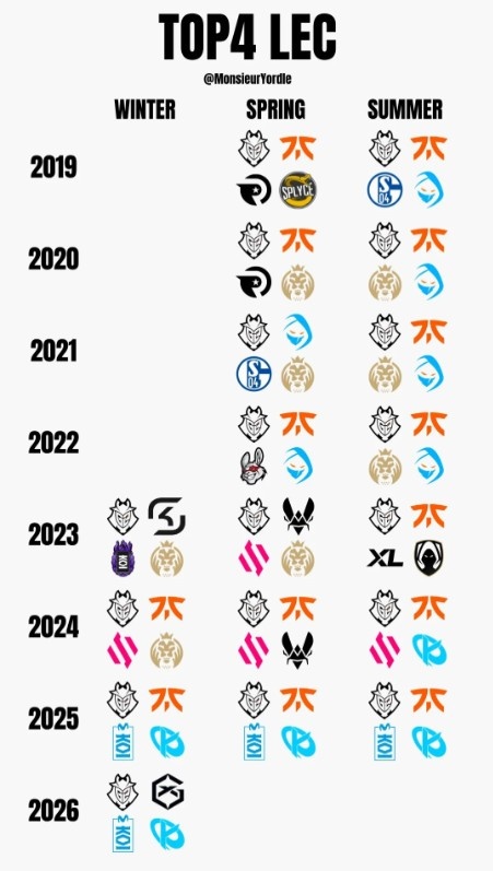 G2自2019年春季赛至2026年冬季赛从未缺席LEC前四席位。