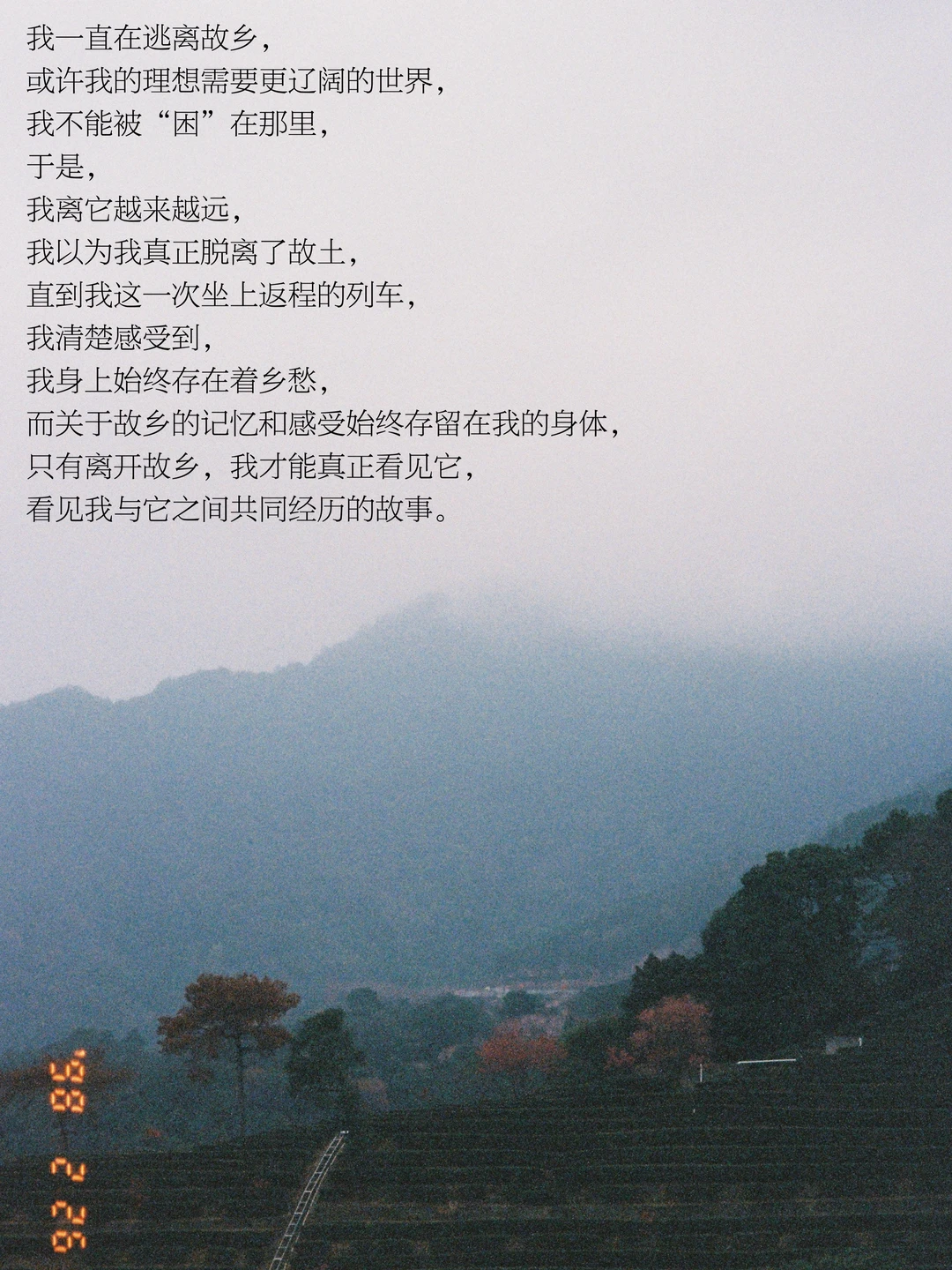 我一直在逃离故乡,或许我的理想需要更辽阔的世界,我不能被“困”在那里,于是,我离它越来越远,我以为我真正脱离了故土,直到我这一次坐上返程的列车,我清楚感受到,我身上始终存在着乡愁,而关于故乡的记忆和感受始终存留在我的身体,只有离开故乡,我才能真正看见它,看见我与它之间共同经历的故事。