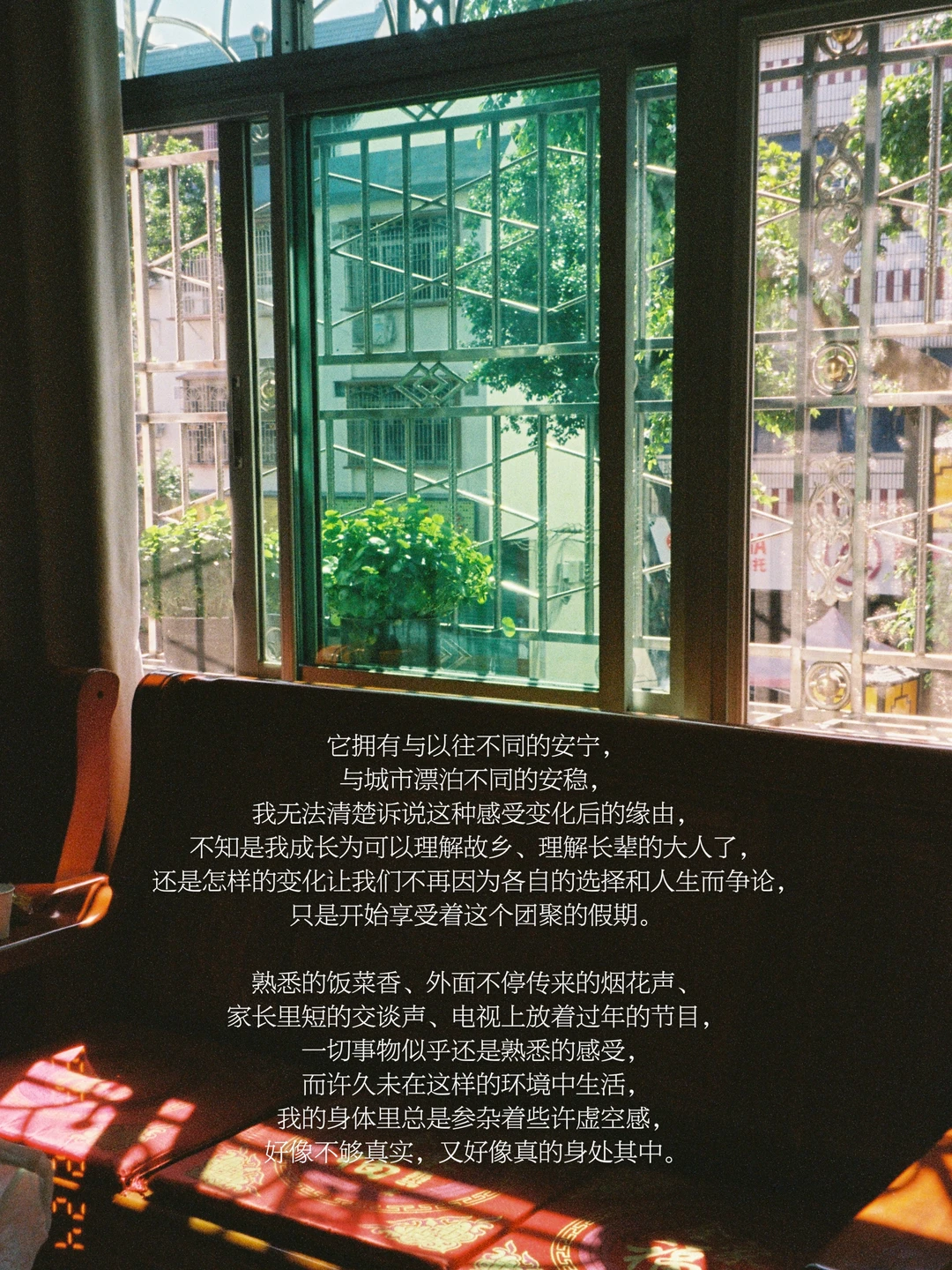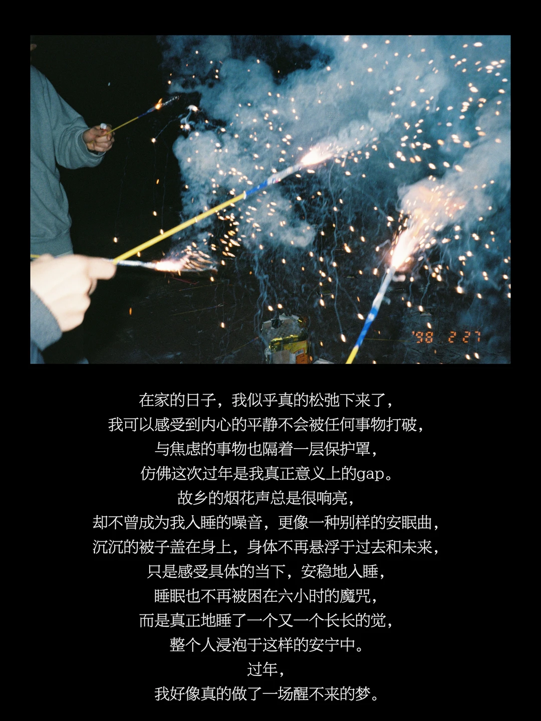 我总有种感受,我们在这一年回到了小时候的年,没有世俗意义的成功将我们束缚在一起,而是被包裹在温暖而平静的日常中。熟悉的饭菜香、外面不停传来的烟花声、家长里短的交谈声、电视上放着过年的节目,而许久未在这样的环境中生活,我的身体里总是参杂着些许虚空感,好像不够真实,又好像真的身处其中。