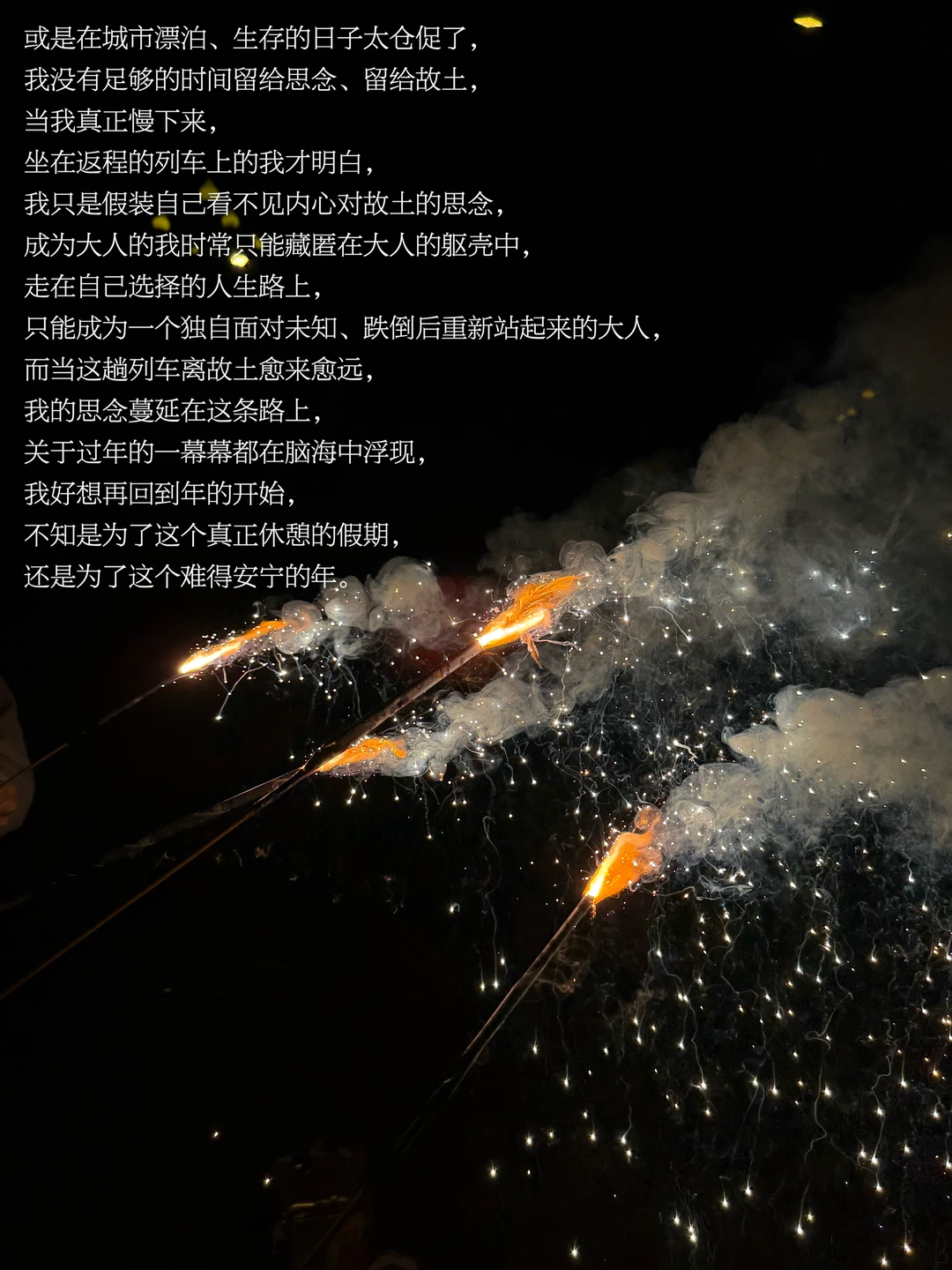 或是在城市漂泊、生存的日子太仓促了,我没有足够的时间留给思念、留给故土,在返程的过程中,我才明白,我只是假装自己看不见内心对故土的思念,只能藏匿在大人的躯壳中,成为一个独自面对未知、跌倒后重新站起来的大人。当这趟列车离故土愈来愈远,我的思念蔓延在这条路上,关于过年的一幕幕都在脑海中浮现,我好想再回到年的开始,不知是为了这个真正休憩的假期,还是为了这个难得安宁的年。