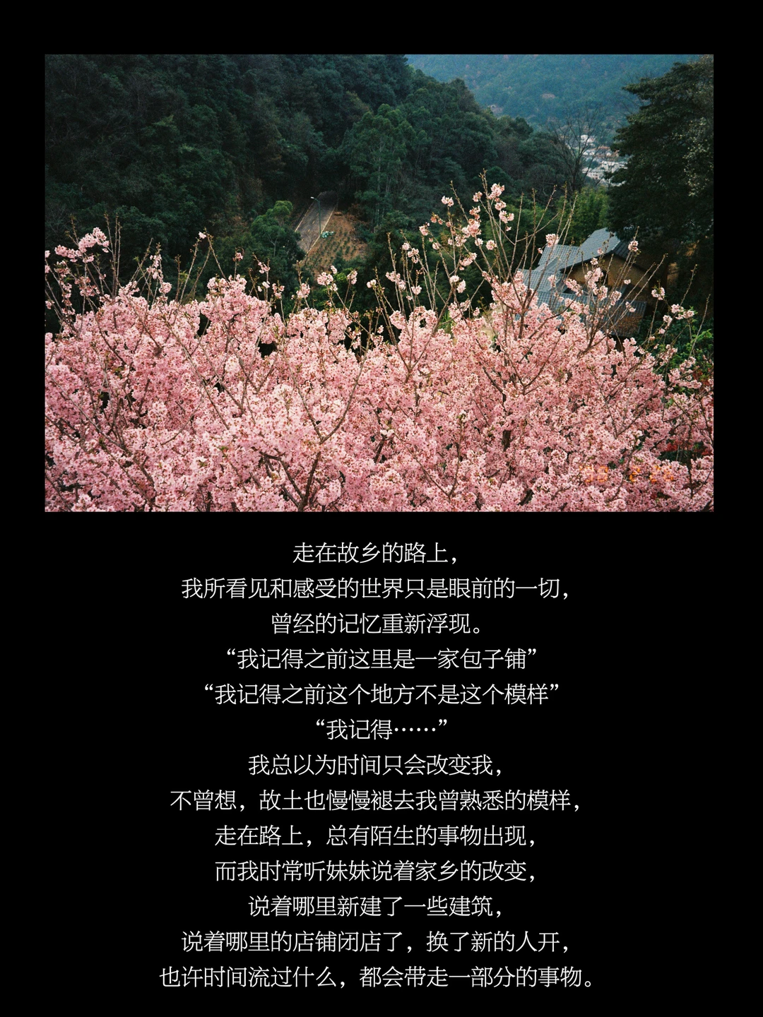 我总以为时间只会改变我,不曾想,故土也慢慢褪去我曾熟悉的模样,走在路上,总有陌生的事物出现,而我时常听妹妹说着家乡的改变,说着哪里新建了一些建筑,说着哪里的店铺闭店了,换了新的人开,也许时间流过什么,都会带走一部分的事物。
