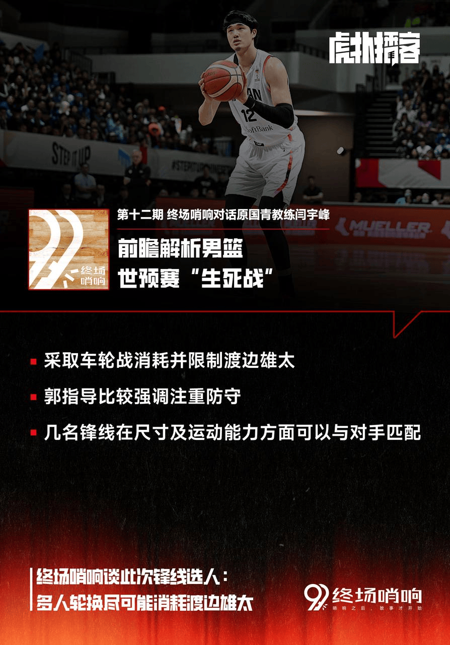 闫指导认为,这样的选人是为了能够更好的限制对手的锋线,尤其是渡边雄太;预测郭指导会采取“车轮战”的策略轮番消耗对手,而且几名锋线的尺寸及运动能力能与对手匹配。