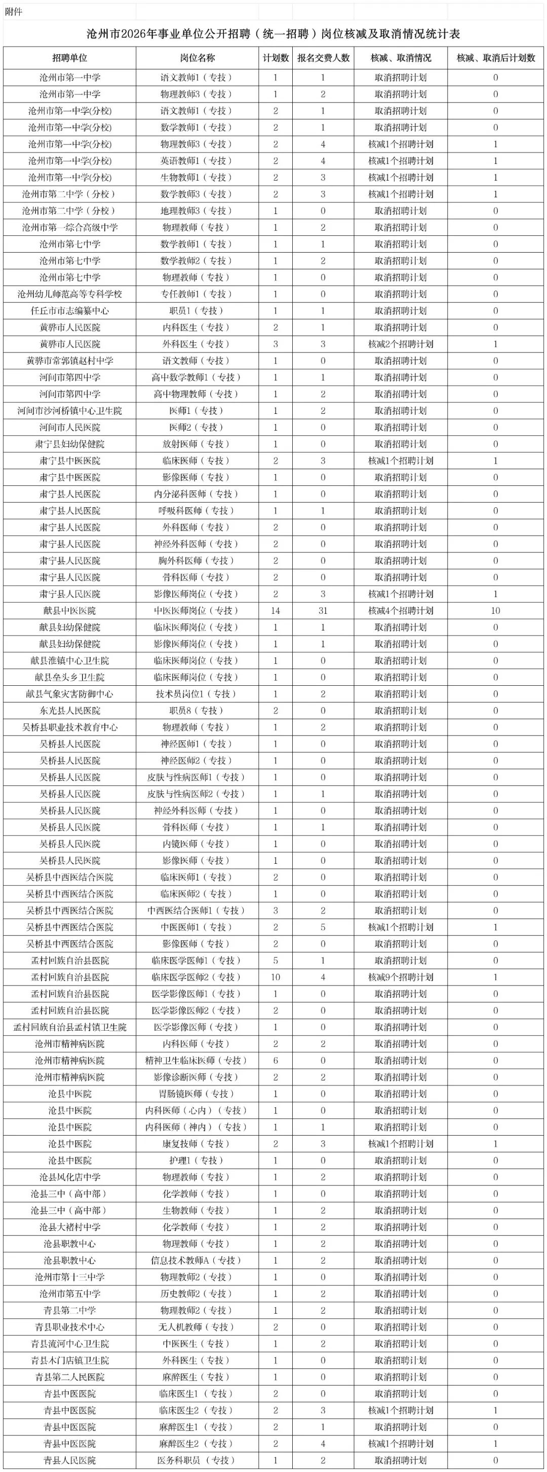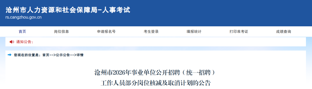 按照《河北省沧州市2026年事业单位公开招聘(统一招聘)工作人员公告》要求,报名工作已于2月14日结束。经统计,部分岗位未达到开考比例,需核减或取消招聘计划。核减及取消岗位情况详见《沧州市2026年事业单位公开招聘(统一招聘)岗位核减及取消情况统计表》(附件)。