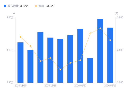 日期A股户数(户)流通A股户均持股数(股)户均持股市值(万元)2026-02-13332345755.4413.772026-02-10339095640.8714.112026-01-30309006190.1715.202026-01-20331555769.1512.732026-01-09326385860.5412.792025-12-31323595911.0712.542025-12-19324655891.7713.132025-12-10328885815.9912.792025-11-28315026071.8814.202025-11-20321005958.7614.43