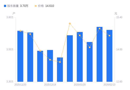 日期A股户数(户)流通A股户均持股数(股)户均持股市值(万元)2026-02-13370336928.1310.122026-02-10372686884.4410.272026-01-30360927108.7610.022026-01-20368736958.1910.172026-01-09366197006.4610.612025-12-31348887354.099.902025-12-19354747232.609.812025-12-10354087246.0910.112025-11-28368336965.7510.232025-11-20369676940.5010.29