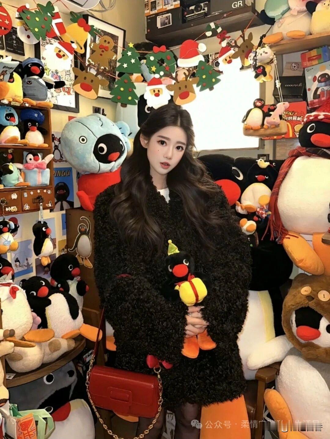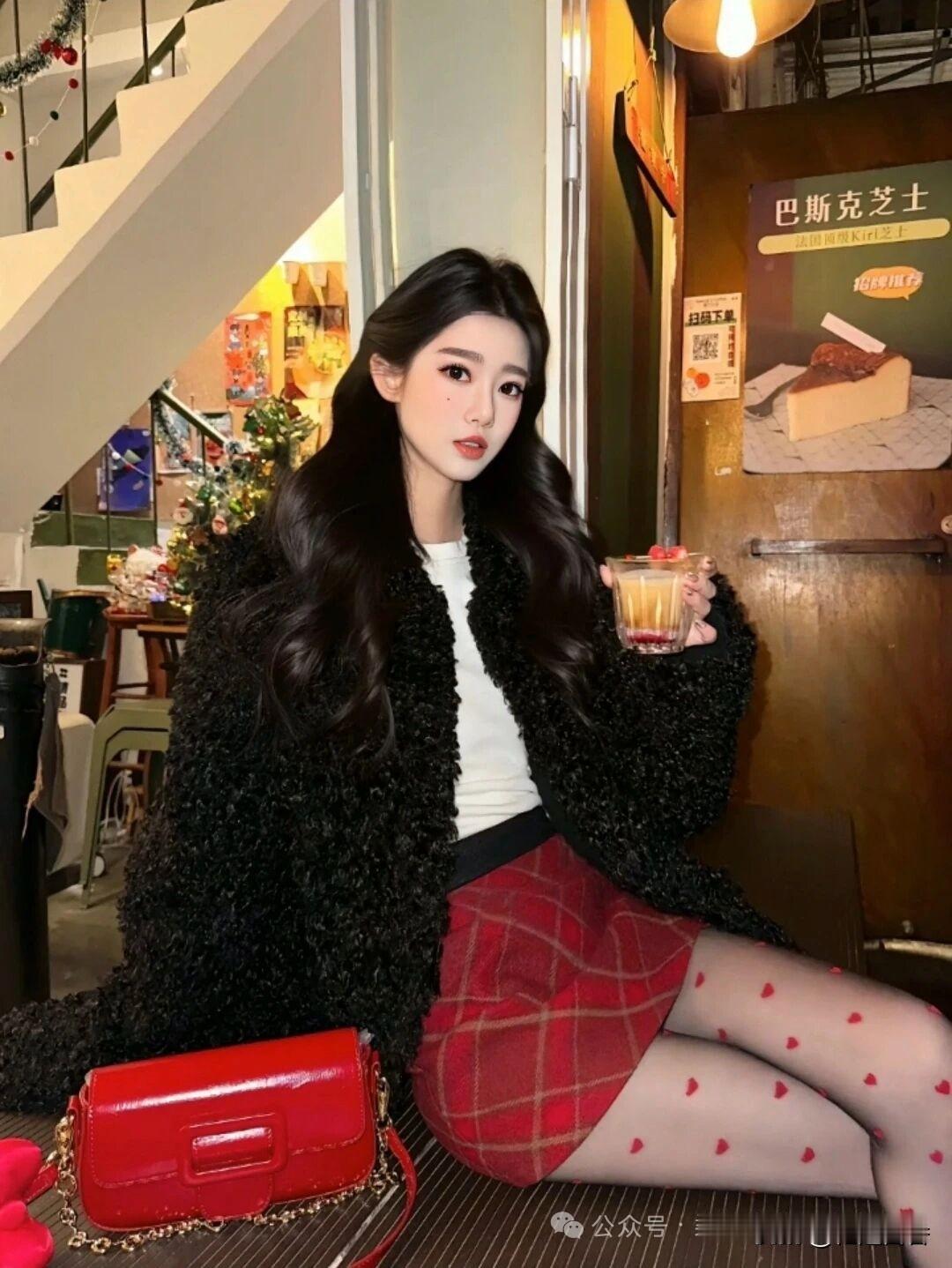 冬日暖阳下,黑毛绒外套与红裙的完美搭配,甜美与酷炫并存。时尚穿搭,今天穿什么?