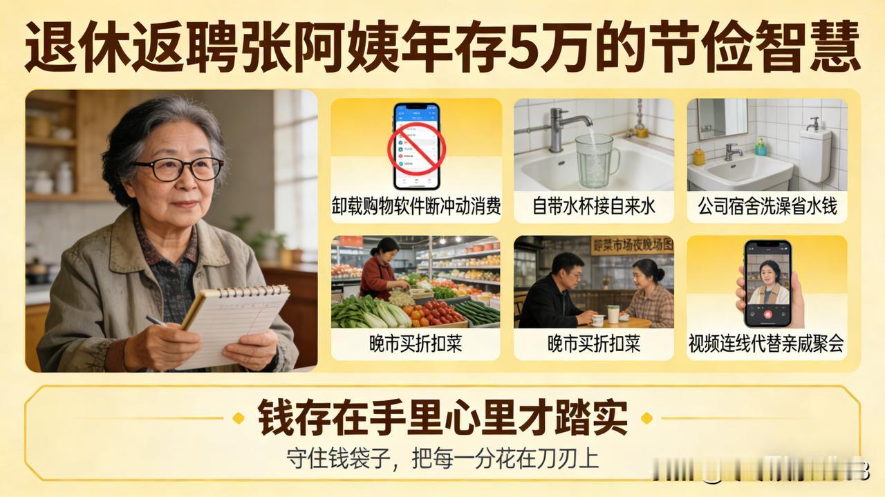 退休返聘的张阿姨年存 5 万引热议,她的做法给年轻人上了生动一课:退休后她没花过一分退休金,卸载购物软件断了冲动消费,自带水杯接自来水代替买饮料,洗澡选公司宿舍省水钱,买菜专挑晚市折扣菜,人情往来只留必要关系,连亲戚聚会都改成视频连线。 每月省下的返聘工资、公司补贴加上退休金,稳稳存下 5 万。阿姨说 “钱存在手里心里才踏实”,这何尝不是最朴素的理财智慧?比起盲目追逐高收益冒风险,守住钱袋子、把每一分花在刀刃上,才是普通人最可靠的安全感来源。年轻人与其焦虑 “月光”,不如学学这种极致自律,把省下来的钱变成未来的底气。
