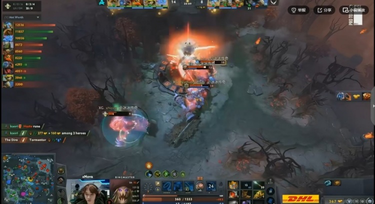 [23分钟]XG下路抓死Kaori杰奇洛之后回头打肉山,NTS小小树林里埋伏被打残,但是可以TP走!残局Kaori交出买活,但是正面xNova百戏奇观轮嘲讽三个,Ame凯单切掉了Mira小松鼠,lorenof帕克追击结果被NTS小小VT贴脸强杀!最终Ws玛尔斯倒下,XG一波1换4反超了5K经济!
