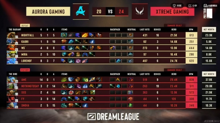 [35分钟]Aurora抱团开雾从上路高地出击想守经验符,直接装雾撞到了XG大部分!Ame凯直接飞身切后排配合队友瞬间秒掉了Ws玛尔斯+Mira小松鼠!Mira交出买活但是正面团Nightfall小狗倒下已经打不过了啊!XG一波1换4,再拆对手上路高地!转中路,Aurora想守结果马尔斯和杰奇洛都被秒交出双买活,Ws玛尔斯框大强行留人,配合队友击杀掉了XG双酱油!但是三大哥已经轻松跑了呀!这波打完XG领先来到20K了!