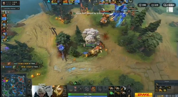 [9分钟]下路Aurora交出TP多打少,XG虽然有人马大但还是没救下Xxs人马本尊,lorenof帕克还多捆了一个!这波Aurora打出0换2!
