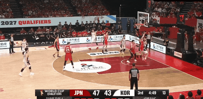 第三节比赛,渡边雄太高高跃起将对手上篮直接大帽扇飞,目前日本领先4分。