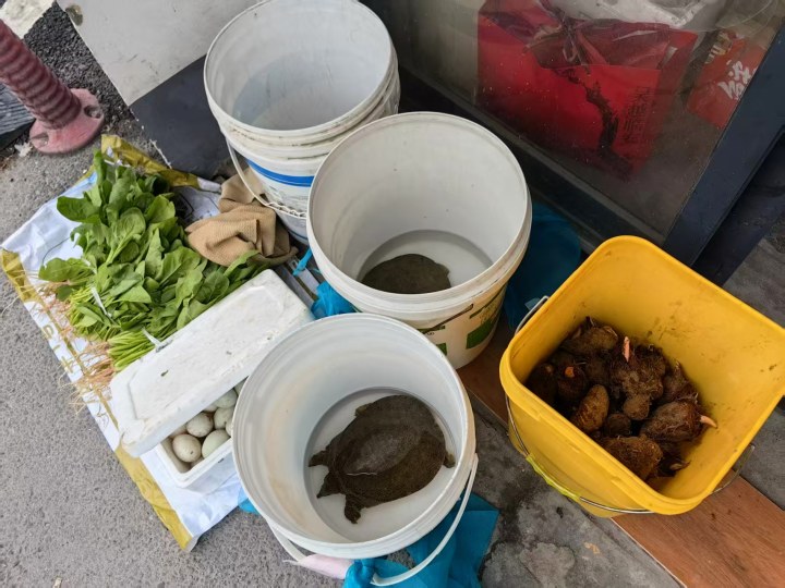 党湾镇曙光村的一个十字路口,王奶奶的小店就在自家楼房的库房,门口摆满了售卖的农产品,青菜、萝卜、花生、土豆、鹅蛋、甲鱼等。青菜萝卜随便卖,给点就行,鹅蛋6元一个,甲鱼40元一斤,鸭蛋6元一斤.....
