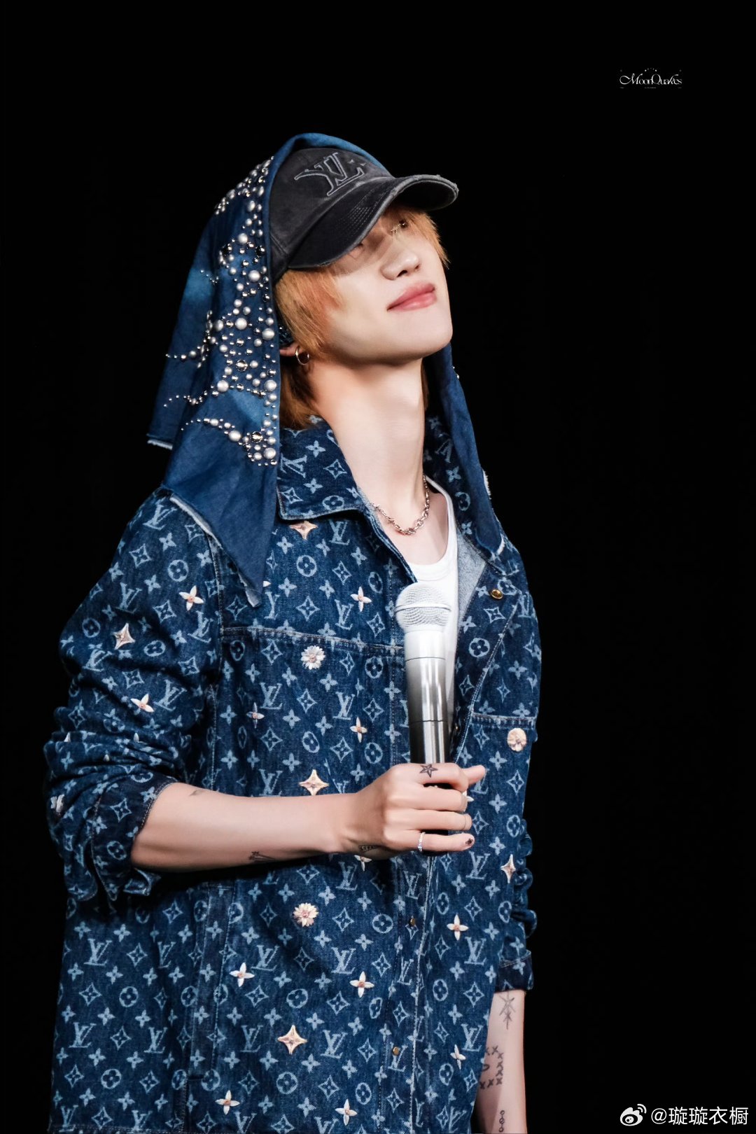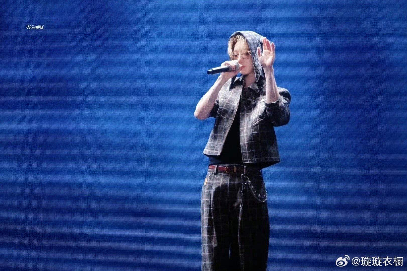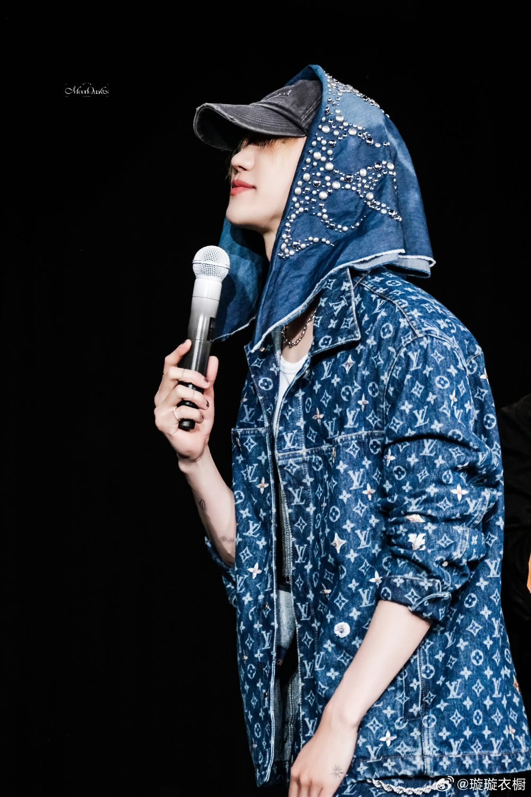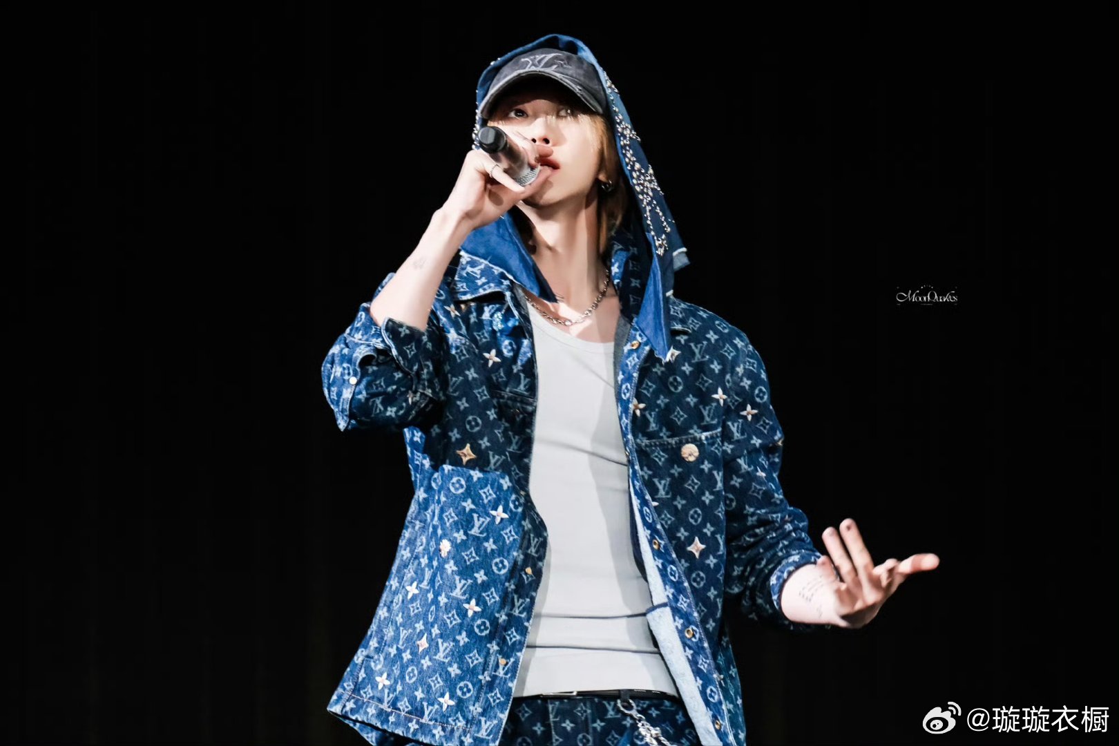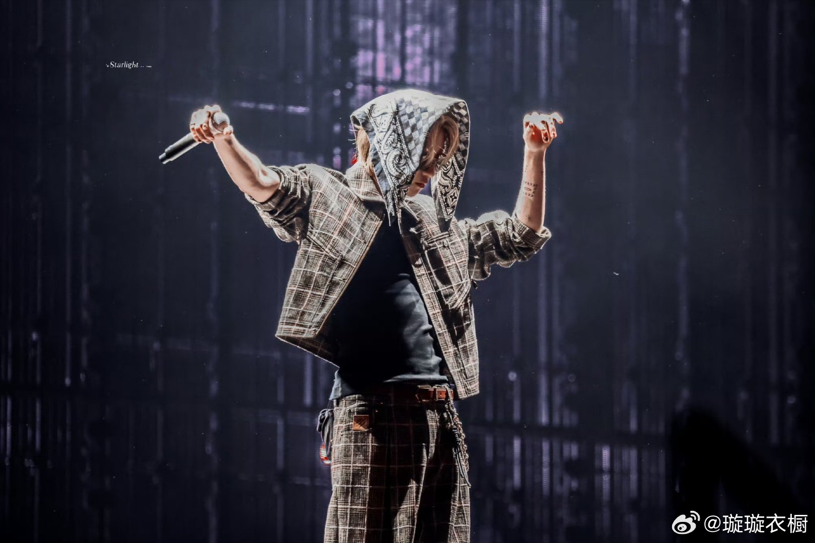 舞台追光吻上麦尖,汗滴在锁骨跳踢踏舞,格纹衣角卷着鼓点,帽檐藏起半阙月光。牛仔星芒落满肩头,每个动作都是青春暴动。徐明浩演唱会穿了特别定制
