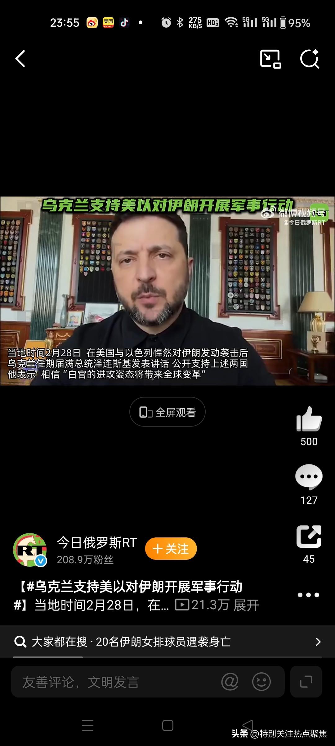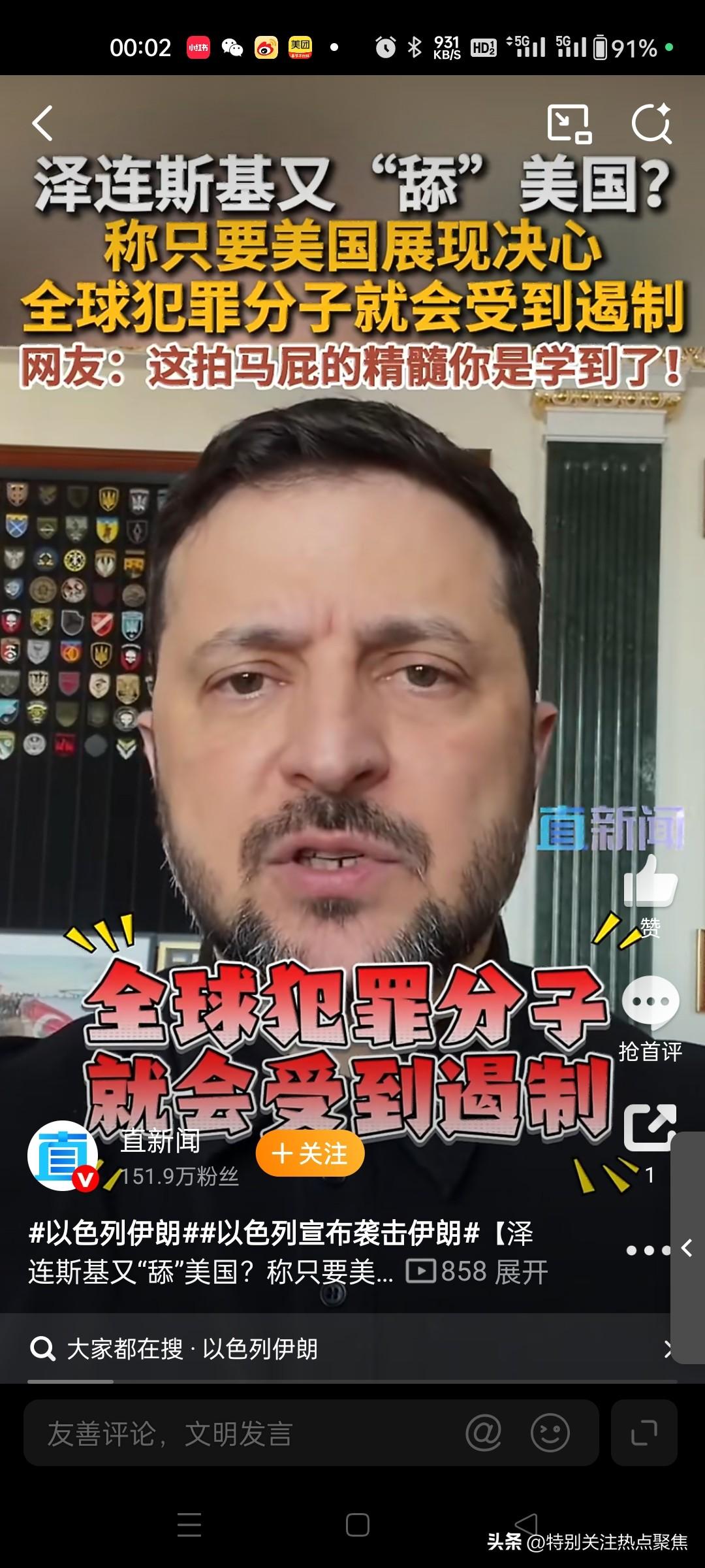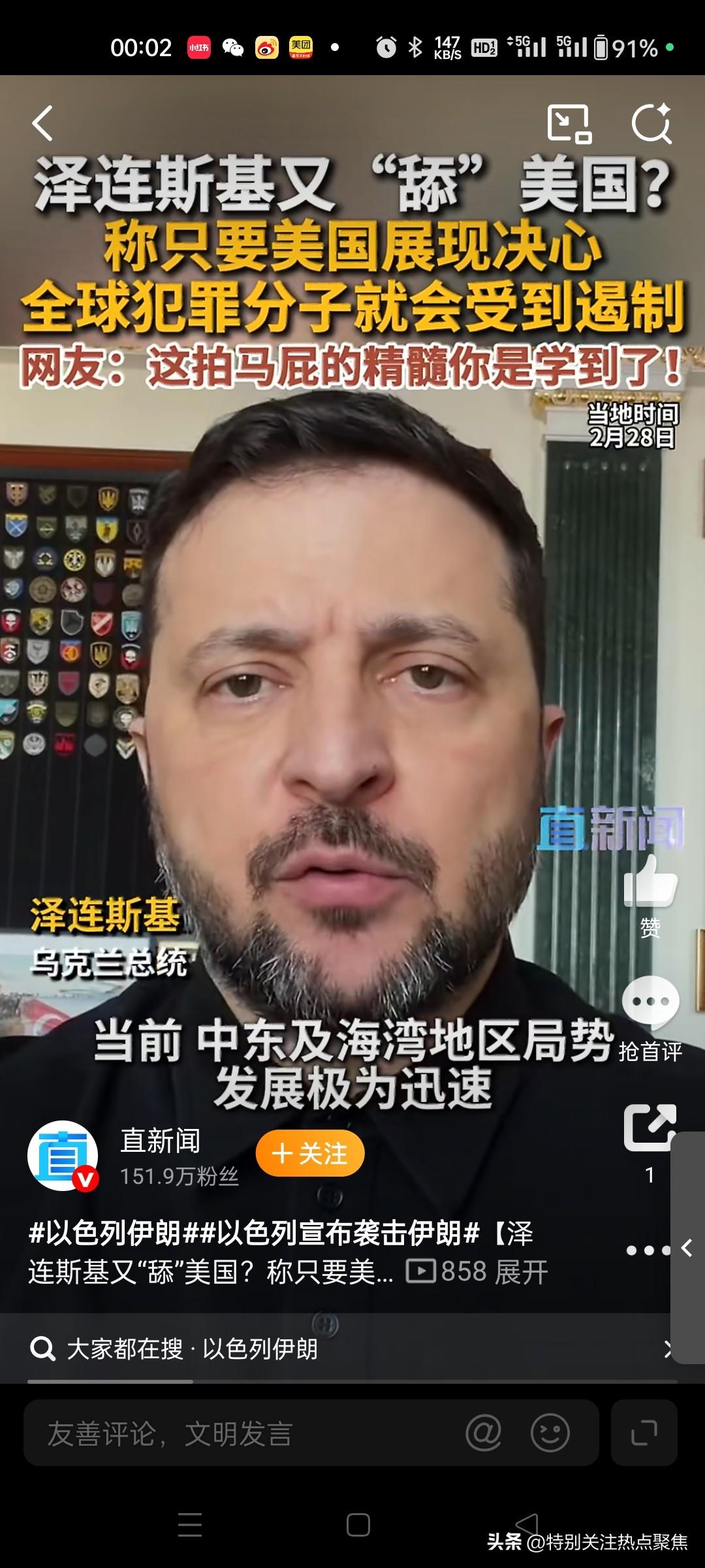 泽连斯基舔美国,支持美国侵略 泽连斯基不仅没有对哈梅内伊遇害表示哀悼,反而公开支持美以的军事行动,甚至将其称为“给伊朗人民摆脱恐怖主义政权的机会”。 🗣️ 核心表态 * 支持打击:泽连斯基明确表态支持美国和以色列对伊朗的军事打击,并希望借此推翻伊朗政权。 * 幸灾乐祸:他乐见美以对伊朗的狂轰滥炸,认为这改变了全球的进攻态势。 🎭 背后动机 泽连斯基此举被普遍视为一种政治投机。由于美国正推动结束俄乌冲突,甚至要求乌克兰进行领土让步,泽连斯基试图通过高调站队美以来讨好特朗普政府,为深陷战争泥潭的乌克兰争取更多支持。 泽连斯基对哈梅内伊遇袭的表态包含两个看似矛盾的核心观点:支持美以军事行动的正当性,同时担忧此举可能彻底断送乌克兰的外援希望。 一、泽连斯基的核心声明 支持美以行动 他公开表示支持美国和以色列对伊朗的军事打击,称这是给予伊朗人民摆脱恐怖主义政权的机会,并强调该行动有助于保障所有国家的安全其措辞中将伊朗政权定性为;恐怖主义政权暗示袭击具有道德正当性。23 对乌克兰危机的悲观预判 他同时警告称,美以的行动可能埋葬乌克兰最后的希望;。这一矛盾表态反映其担忧:西方国家对伊朗的军事投入将分散本可用于支援乌克兰的资源,使深陷俄乌战争(时已持续四年)的乌克兰陷入更孤立境地。@体育男孩小江新浪军事 二、立场背景与深层动因 历史立场冲突 泽连斯基对伊朗的敌意源于该国在俄乌战争中向俄罗斯提供无人机和导弹。2026年2月,他曾在慕尼黑安全会议高调会见伊朗流亡的巴列维王朝王储,商讨"推翻哈梅内伊政权",被视作对伊朗的公开宣战。 战略利益矛盾 其表态的矛盾性揭示乌克兰的困局: 支持美以可巩固西方盟友关系,符合其反俄立场;@乌龙谈 但军事资源向伊朗转移将加剧乌克兰战场劣势(当时乌军哈尔科夫防线已岌岌可危)。 三、事件本身的混乱信息 哈梅内伊生死存疑 尽管伊朗官方及多国媒体宣布哈梅内伊在袭击中身亡,但伊朗外交部发言人同日声明称哈梅内伊与总统"安然无恙"。这种矛盾显示信息战特征,需谨慎采信单一信源。@刘成春 国际反应两极化 支持方:哈马斯谴责美以"侵犯主权",称哈梅内伊为"抵抗运动的支持者"; 批评方:俄罗斯总统普京定性袭击为"违反国际法的卑鄙谋杀"。 四、泽连斯基表态的潜在风险 其言论可能加速两大危机: 乌克兰外援萎缩 西方已显露疲态(如美国国务卿取消乌战专题会谈),公开抱怨资源分流恐加剧盟友疏离。 伊朗报复升级 伊朗革命卫队声明将"严惩凶手",泽连斯基的站队可能招致伊朗更深度介入俄乌战争,例如向俄提供高超音速导弹技术。@帅车评