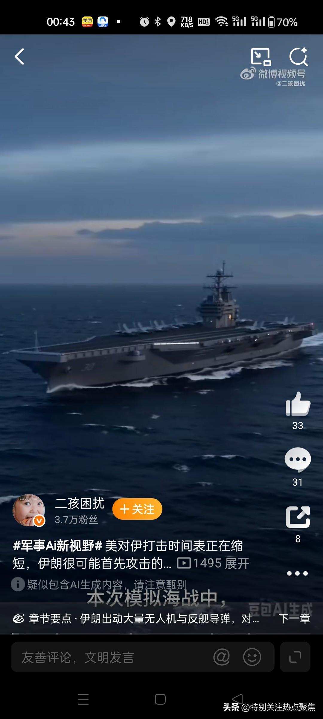深夜突发!美国航母,遭伊朗导弹袭击 美军,刚刚回应! 伊朗,传出新消息! 据央视新闻刚刚消息,当地时间3月1日,美国军方表示,“亚伯拉罕·林肯”号航母未遭伊朗袭击,并称伊朗发射的导弹“甚至没有接近”该舰。美军称,目前没有美军舰艇受损或人员伤亡报告。 关于“美国航母遭伊朗导弹袭击”的消息,目前美军已正式辟谣。美国中央司令部明确表示,伊朗发射的导弹“甚至没有接近”航母,舰载机仍在正常执行任务。 🚫 美军辟谣:导弹未接近 针对伊朗宣称的“4枚导弹袭击”,美军回应称: * 航母无恙:“亚伯拉罕·林肯”号航母未被击中,目前没有舰艇受损或人员伤亡报告。 * 行动正常:该航母仍在持续出动舰载机,支持美军在中东的军事行动。 ⚠️ 冲突背景:局势持续升级 虽然航母未受攻击,但中东局势确实处于高度紧张状态: * 伊朗警告:伊朗革命卫队发布公告,称打击已进入新阶段,并警告“陆地和海洋都将成为侵略者的坟场”。 * 美军伤亡:美军承认在名为“史诗般的狂怒”的军事行动中,已有3名士兵阵亡,另有5人重伤。美国对伊朗开战 美军攻打伊朗 伊朗美军对峙 美国入侵伊朗