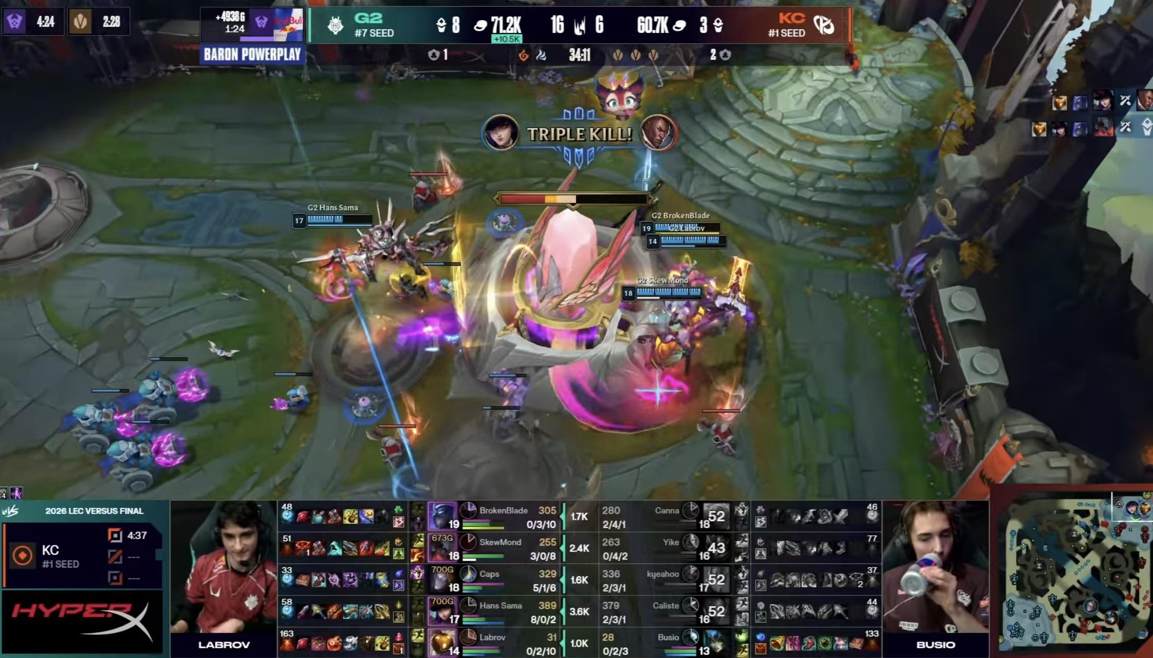 虎扑03月02日讯LEC第一赛段决赛今晨结束。G2在一度2-0领先被连追两局的情况下决胜局力克KC拿下LEC第一赛段冠军。