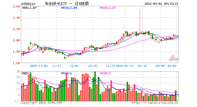 3月2日,科创成长ETF(588110)开盘跌0.34%,报2.080元。科创成长ETF(588110)重仓股方面,海光信息开盘跌2.31%,寒武纪跌2.38%,拓荆科技跌3.08%,源杰科技跌2.33%,九号公司跌1.04%,国盾量子跌3.26%,仕佳光子跌3.65%,百利天恒跌1.52%,思特威跌1.45%,铂力特跌1.18%。