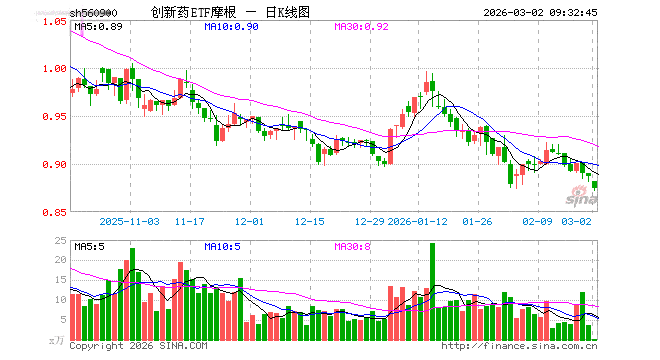 3月2日,创新药ETF摩根(560900)开盘跌0.56%,报0.882元。创新药ETF摩根(560900)重仓股方面,药明康德开盘跌1.95%,恒瑞医药跌1.73%,华东医药跌0.78%,复星医药跌0.72%,科伦药业跌1.08%,百济神州跌1.51%,长春高新跌2.13%,康龙化成跌1.08%,泰格医药跌1.74%,艾力斯跌0.77%。