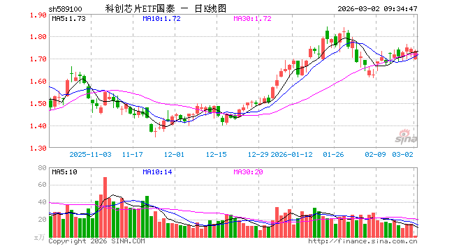 3月2日,科创芯片ETF国泰(589100)开盘跌2.70%,报1.696元。科创芯片ETF国泰(589100)重仓股方面,中芯国际开盘跌1.84%,海光信息跌2.31%,寒武纪跌2.38%,澜起科技跌2.76%,中微公司跌1.17%,拓荆科技跌3.08%,芯原股份跌0.92%,华虹公司跌2.89%,沪硅产业跌2.16%,东芯股份跌2.79%。