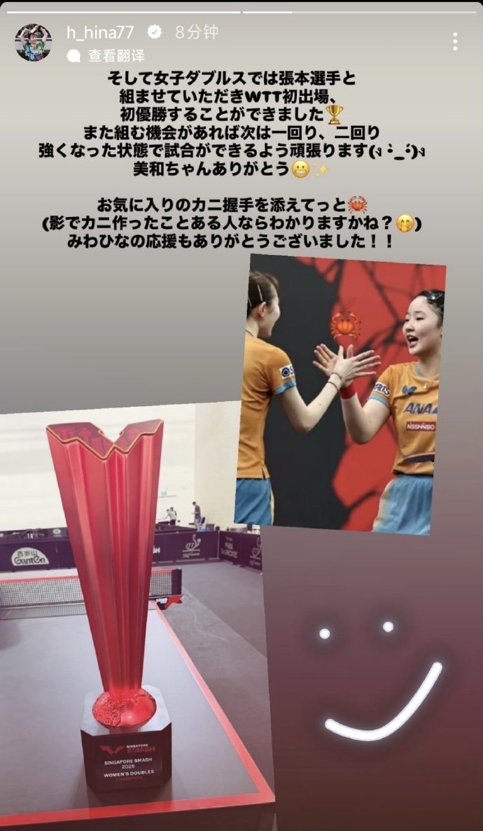 在女双比赛中,我有幸和张本选手搭档,这是我WTT的首次出场,也首次拿到了冠军🏆如果还有机会搭档,我会努力以更强的状态再次站上赛场。美和酱,谢谢你😫✨配上我最喜欢的螃蟹握手🦞(在幕后做过螃蟹手势的人应该都懂吧?😌)