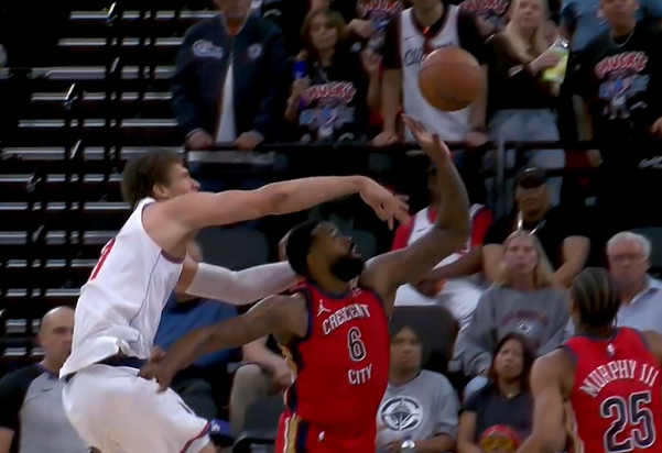 篮网队首发中锋洛佩兹跟快船队首发中锋小乔丹抢篮板时犯规