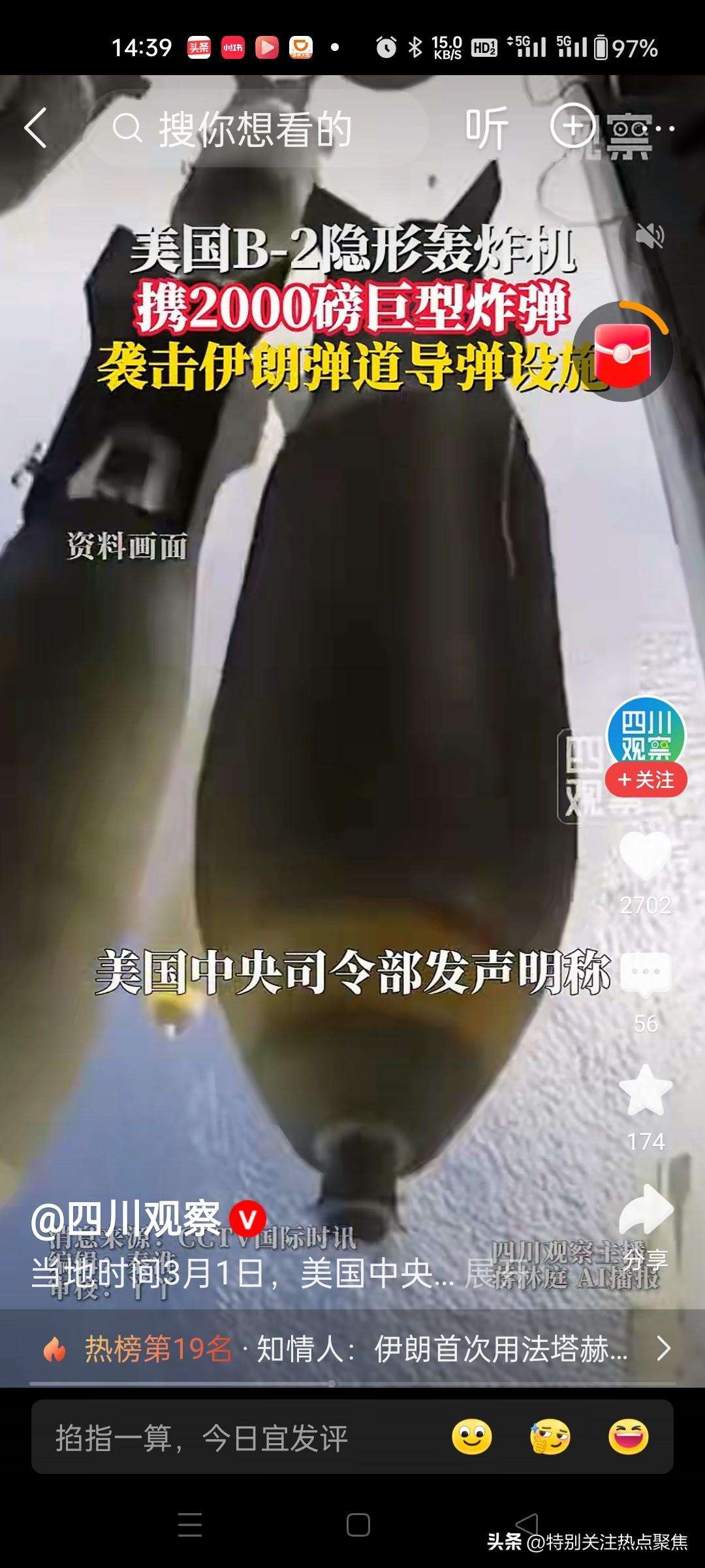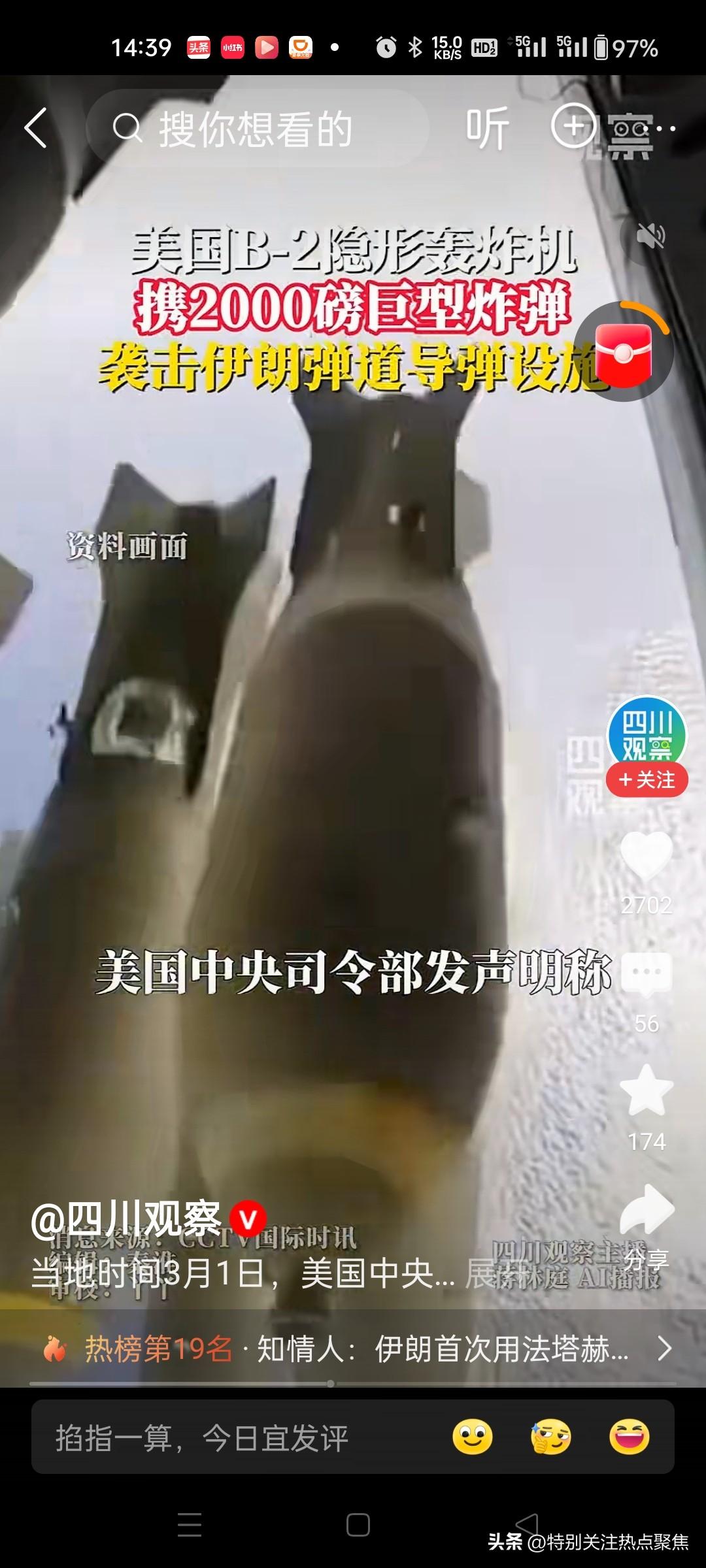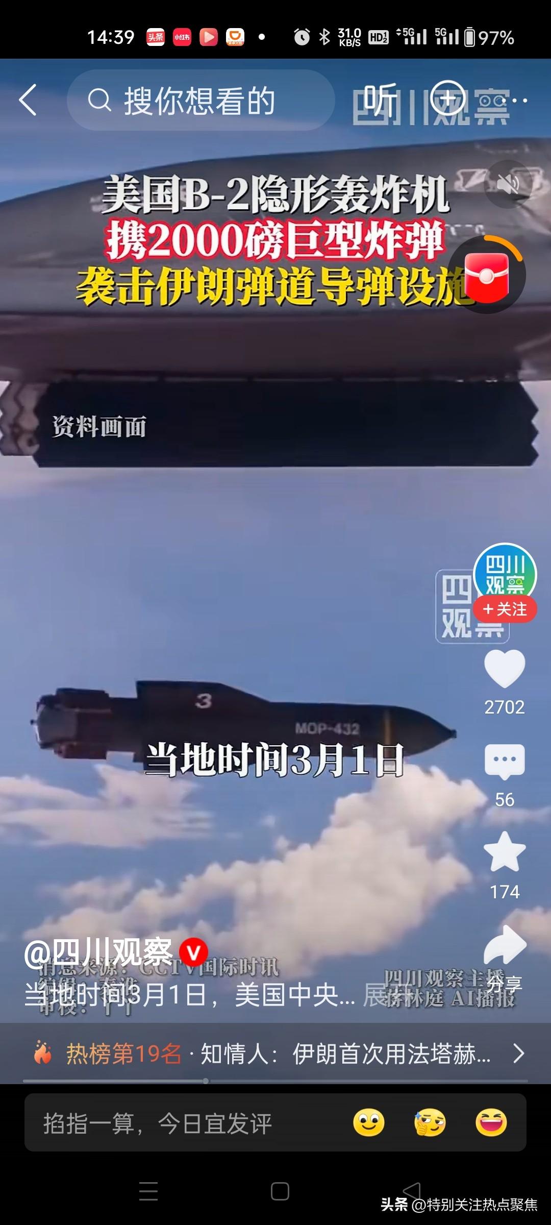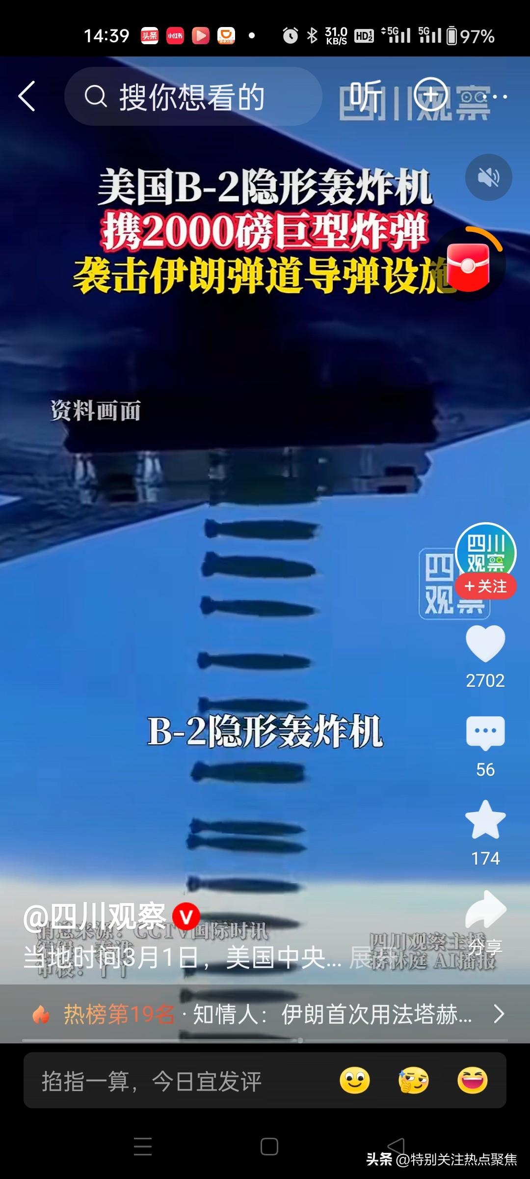 军事观察美军动用了B-2“幽灵”隐形轰炸机,对伊朗的地下弹道导弹基地实施了精准打击。这波操作的核心逻辑是:“以攻代守”,通过摧毁伊朗的导弹库存,来缓解美以反导系统的拦截压力。 🛩️ 打击详情 * 执行方:美军B-2隐形轰炸机(呼号PETRO41-44)。 * 目标:伊朗加固的地下弹道导弹设施(如伊斯法罕、大不里士等地的导弹洞库)。 * 武器:2000磅级钻地炸弹(GBU-31 JDAM),部分报道提及可能使用了GBU-57巨型钻地弹(MOP)。 * 战术:利用B-2的隐身优势夜间突防,重点打击洞穴入口和发射井,通过“封堵”而非“完全摧毁”的方式,使伊朗导弹在冲突期间无法使用。 💡 为什么是B-2? 美军选择B-2,是因为它具备“隐身+钻地”的双重能力,专门克制伊朗的“洞库战术”。 * 隐身突防:B-2的雷达反射截面极小,能悄无声息地穿透伊朗的防空网(如S-300系统),直接打击核心目标。 * 钻地毁伤:伊朗将导弹深藏于山体或地下,普通炸弹难以摧毁。B-2携带的重型钻地弹能穿透数十米厚的混凝土,直接命中导弹储存区。 ⚔️ 战略意图 美军此举旨在“釜底抽薪”。与其被动消耗昂贵的反导拦截弹(如“爱国者”、“萨德”),不如主动出击,在导弹发射前就将其摧毁在洞库里。这不仅能削弱伊朗的报复能力,也能为后续的地面行动扫清障碍。