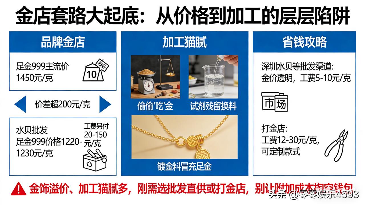 花大价钱买金饰的朋友注意!前金店员工爆料:金店套路比你想的多! 咱们先看数据:品牌金店足金 999 主流价 1450 元 / 克,水贝批发价仅 1220-1230 元 / 克,光价差就超 200 元 / 克,工费还得另付 20-150 元 / 克,实际成本被层层抬高。 更隐蔽的是加工环节:前员工透露,金店会用 “损耗”“试剂残留” 做文章,比如你拿旧金去加工,称重时偷偷 “吃” 点金,或者用化学试剂清洗后偷偷换料,甚至用镀金料冒充足金。 想省钱?避开品牌金店!深圳水贝等批发渠道金价透明,加工费仅 5-10 元 / 克;打金店工费 12-30 元 / 克,还能定制款式,性价比超高。 提醒:金饰溢价、加工猫腻多,刚需可选批发直供或打金店,别让附加成本掏空钱包!