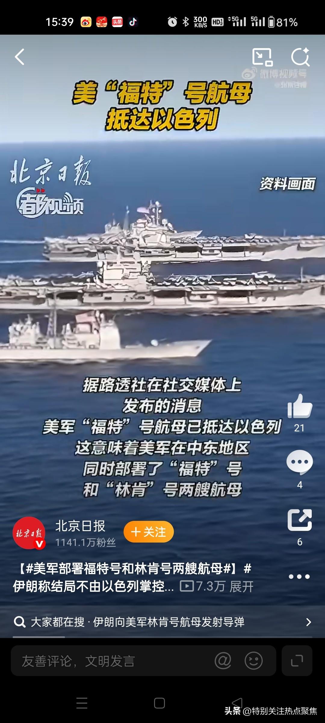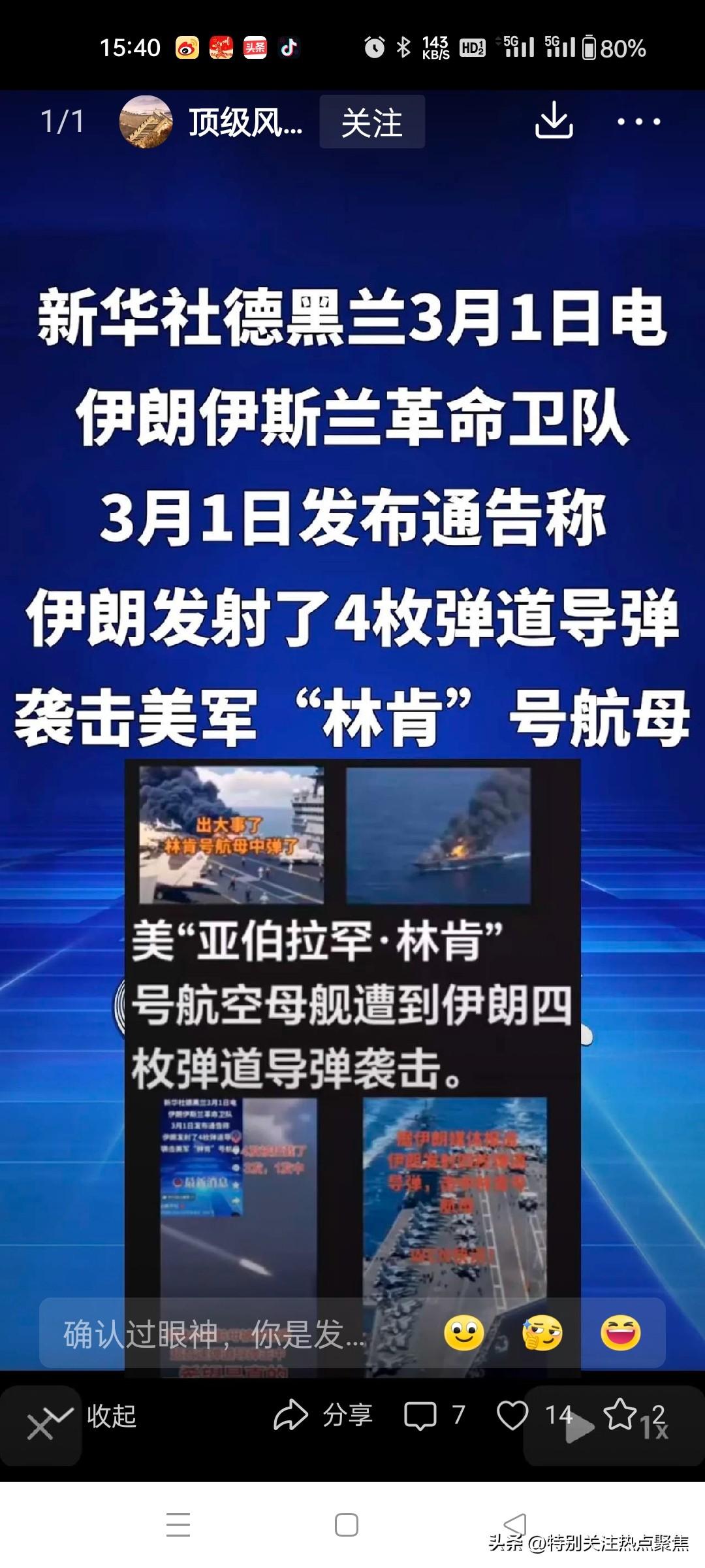 美国航母被炸,伊朗人解气 央视确实报道了相关事件,但没有确认美国航母被炸,而是呈现了双方完全相反的说法 1 : 一、伊朗说法(央视报道) 当地时间3月1日,伊朗伊斯兰革命卫队称: 用4枚弹道导弹袭击了美军亚伯拉罕·林肯号航母 1 宣称导弹命中目标,航母受损 二、美军说法(央视报道) 美军立即否认:导弹甚至没有接近航母 1 航母毫发无损,舰载机正常起降,无人员伤亡 1 美军伤亡来自陆上基地,与航母无关 三、央视报道结论 央视只客观转述双方声明,未证实航母被炸,目前是“罗生门”状态。 关于“美国航母被炸”的核心争议聚焦于伊朗军方宣称袭击美军林肯号航母,而美方坚决否认击中,双方说法陷入罗生门。 ⚔️ 一、事件核心冲突:伊朗宣称成功袭击 vs 美军全盘否认 伊朗单方面宣布战果 伊朗伊斯兰革命卫队于3月1日发布公告,称向美军“亚伯拉罕·林肯”号航母发射4枚弹道导弹,并强调“陆地和海洋都将成为侵略者的坟场”。部分外媒(如以色列第九频道)佐证袭击发生,但未提及具体毁伤效果。 @央视新闻1633 美军坚决否认并反制 美国中央司令部迅速驳斥,称导弹“未接近航母”,舰载机正常执行任务,且未发现舰体损伤或人员伤亡。美军同步击沉一艘伊朗船只作为回应。@环球时报7882李翔看世界狂傲狂生北京日报木木很瘦丫第一军情毽客逆风飞扬 🔍 二、技术争议与第三方分析 导弹能力与防御系统矛盾 伊朗声称使用新型“法塔赫-2”高超音速导弹,但军事专家指出,航母打击群具备“标准-6”导弹、“密集阵”近防炮等多层防御体系,拦截高速目标成功率较高。@科罗廖夫 第三方开源情报推测,导弹更可能命中护航编队中的补给舰(如4.8万吨级支援舰),而非航母本身。@打工归来啊 信息战痕迹明显 网传“航母起火”视频被证实为AI合成,伊朗曾多次播放模拟击沉美航母宣传画面,加剧信息甄别难度。@司马平邦 中方军事博主指出,伊朗对300公里外移动目标的捕捉能力有限,技术层面难以实现精准命中。4168科罗廖夫司马平邦 🌍 三、冲突背景与连锁反应 导火索:美以联合斩首行动 袭击发生于2月28日美以空袭伊朗之后,该行动导致伊朗最高领袖哈梅内伊及前总统内贾德身亡,伊朗代号“真实承诺-4”的报复随即启动。@新闻姐4870 地区局势剧烈升级 能源动脉中断:伊朗封锁霍尔木兹海峡,全球20%石油运输受阻,国际油价单日暴涨超7%。@长安万里行 多国卷入战火:阿联酋拦截超500架无人机及导弹仍致平民伤亡;以色列贝特谢梅什遭袭致9死28伤。@貔貅视点 代理人战争扩大:胡塞武装、黎巴嫩真主党同步参战,向以色列发射超300枚导弹。@评点一哥新闻姐 ⚠️ 四、伤亡数据与舆论战 主张方 伤亡报告 关键依据 伊朗 约560名美军死亡 单方面战报,未提供具体证据 美国 3死5重伤 中央司令部官方通报 双方数据悬殊凸显战时宣传博弈,实际伤亡仍待独立验证。@李翔看世界650何天恩 💎 五、事件本质与未来风险 此次冲突本质是美伊“宣称-否认”的信息对抗: 伊朗意图:通过象征性打击重塑国内凝聚力,回应美以斩首行动;6255 美国策略:技术性否认以削弱伊朗心理威慑,避免战略威信受损;76 潜在风险:若伊朗后续发动饱和攻击或封锁海峡,可能引发全球能源危机与人道灾难。68 📌 提示:当前信息高度依赖战时宣传,需谨慎对待未经验证的袭击视频或图片。