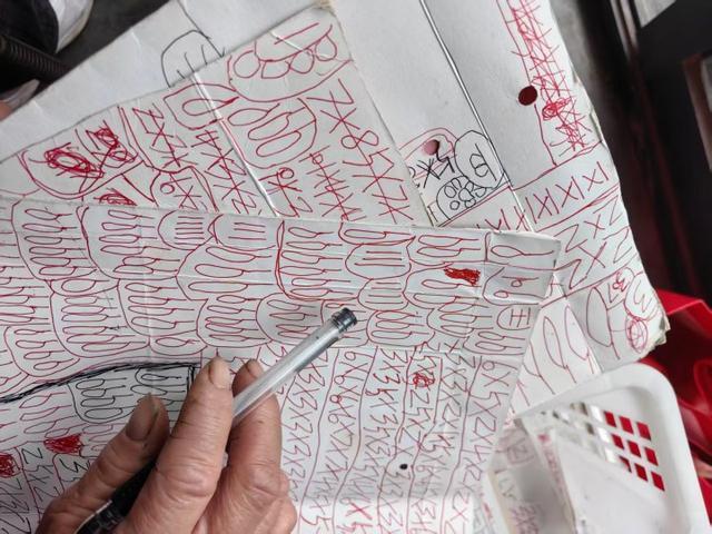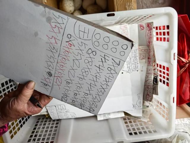 王奶奶从框里拿出一张张用纸板壳记的账单,但这些账单更像是“象形文”,没有王奶奶的解释根本看不懂。