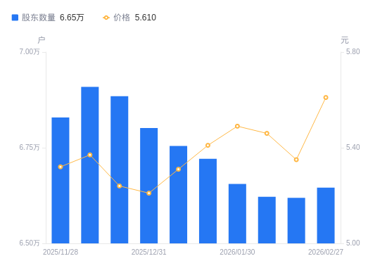 日期A股户数(户)流通A股户均持股数(股)户均持股市值(万元)2026-02-276645513578.437.622026-02-136619113632.597.292026-02-106621913626.827.442026-01-306655213558.647.442026-01-206721113425.707.262026-01-096754413359.517.092025-12-316801713266.606.912025-12-196884613106.856.872025-12-106908913060.757.012025-11-286829113213.377.03