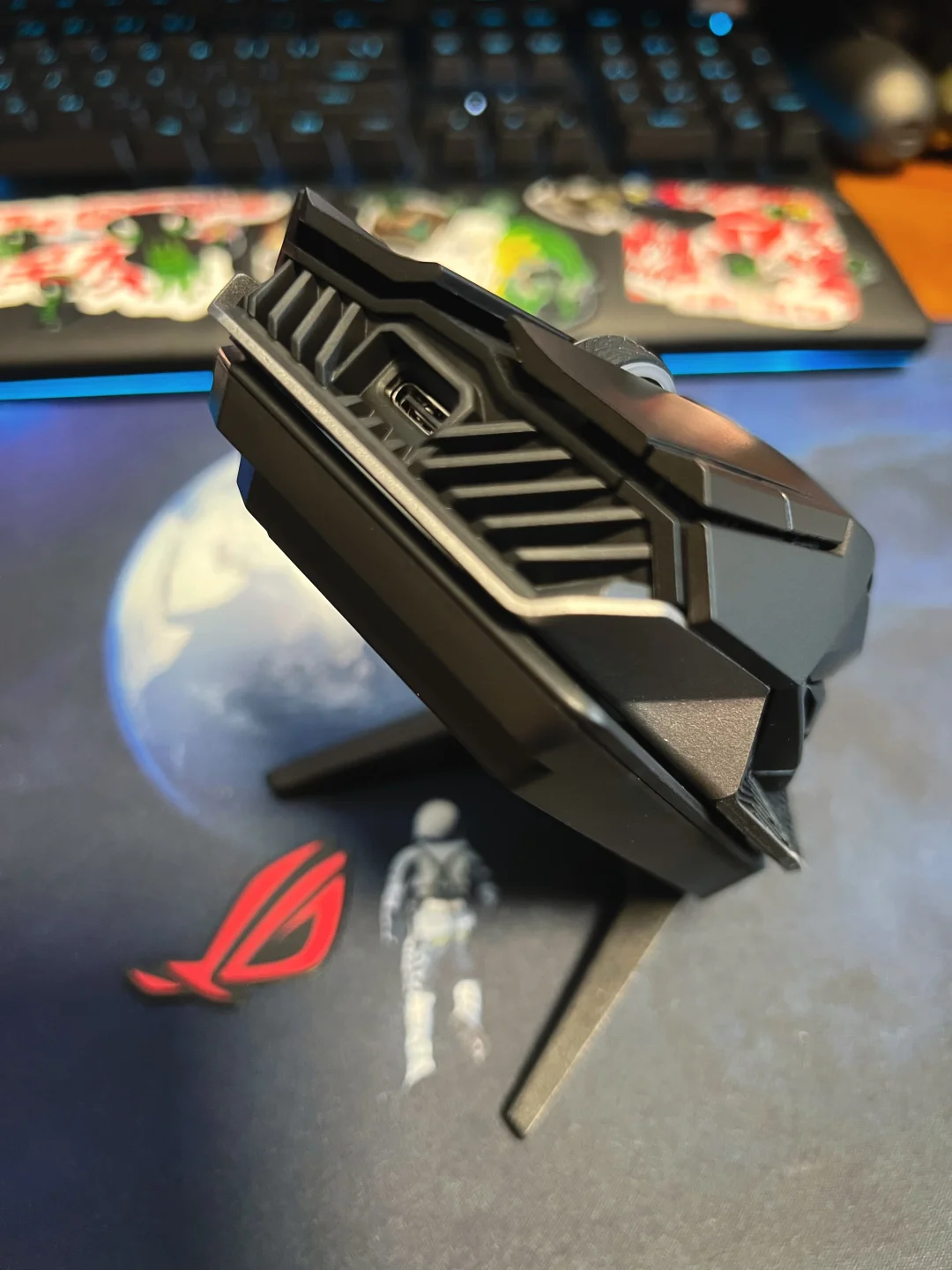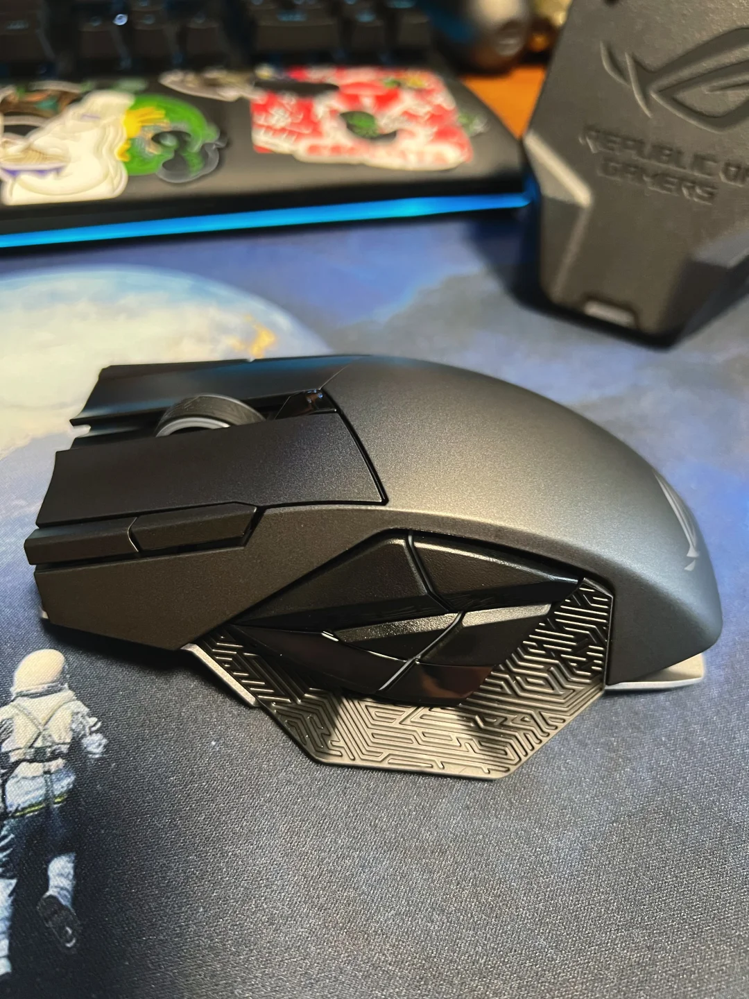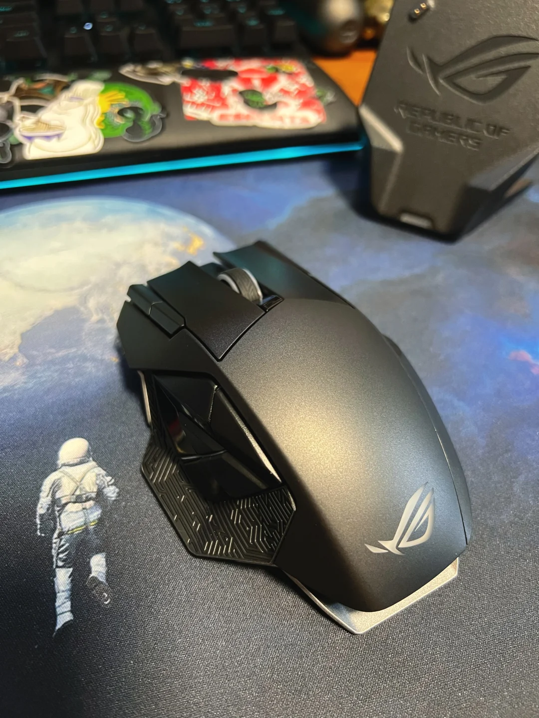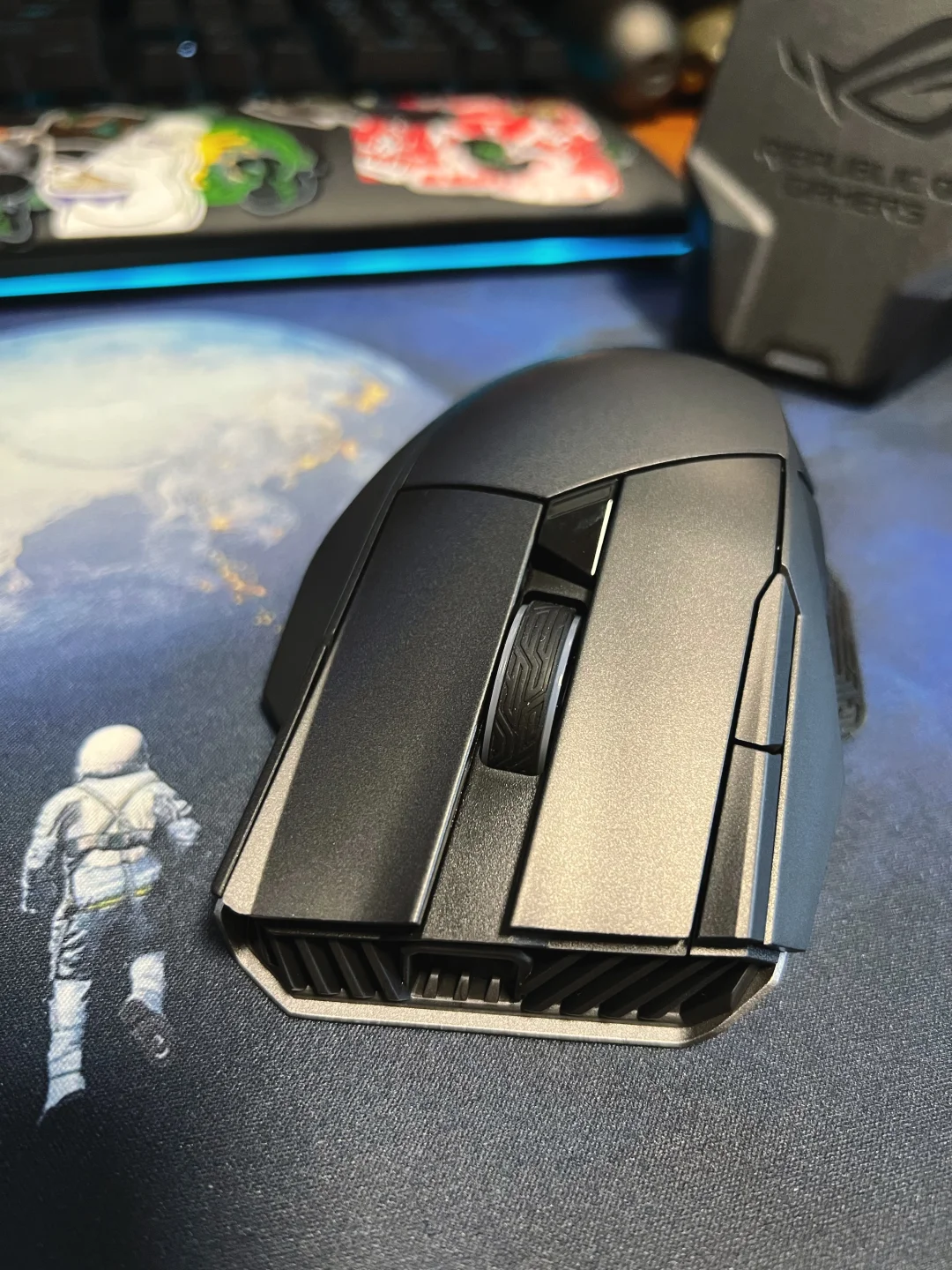 华硕ROG斯巴达X无线游戏鼠标图测,这款鼠标体型较大,感觉有个D杯[doge],抓握起来少了些许驾驭感,如果你感觉你手比较小的话,这款鼠标可以自行跳过。颜值方面我给八分,有金属质感,但差了一丝棱角分明的犀利感。