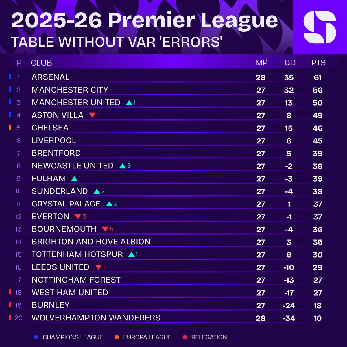 虎扑03月03日讯根据Squawka统计,英超联赛本赛季如果VAR没有“误判”,那么当前的积分排名将会发生一些变化。以下是第28轮比赛后如果英超没有VAR误判的排名: