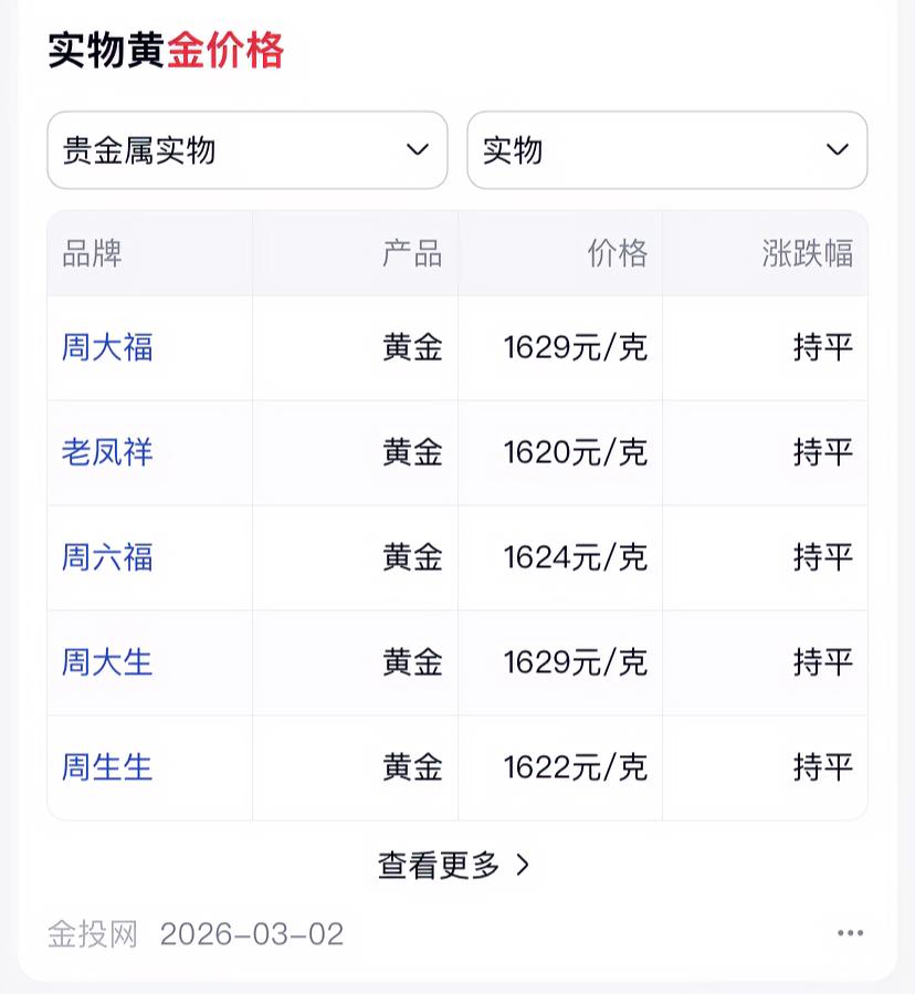 昨天听朋友说,金价涨到一克1629元左右,黄金回收价也到了1200元上下,我从网上查了下,果然如此。手里有黄金的,这回真的赚翻了。 老话说:“乱世黄金,盛世古董”。局势不稳定,黄金越涨,说明钱越来越难赚。 金价涨得如此高,本想把家里的一点旧金去卖了,赚回一笔,现在下定决心不卖了。 黄金是硬通货,手上有粮,心里不慌。涨跌我们控制不了,留着才是最踏实的保障。友友们,认同吗?
