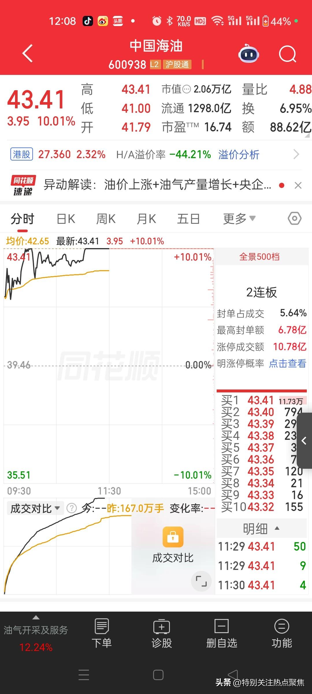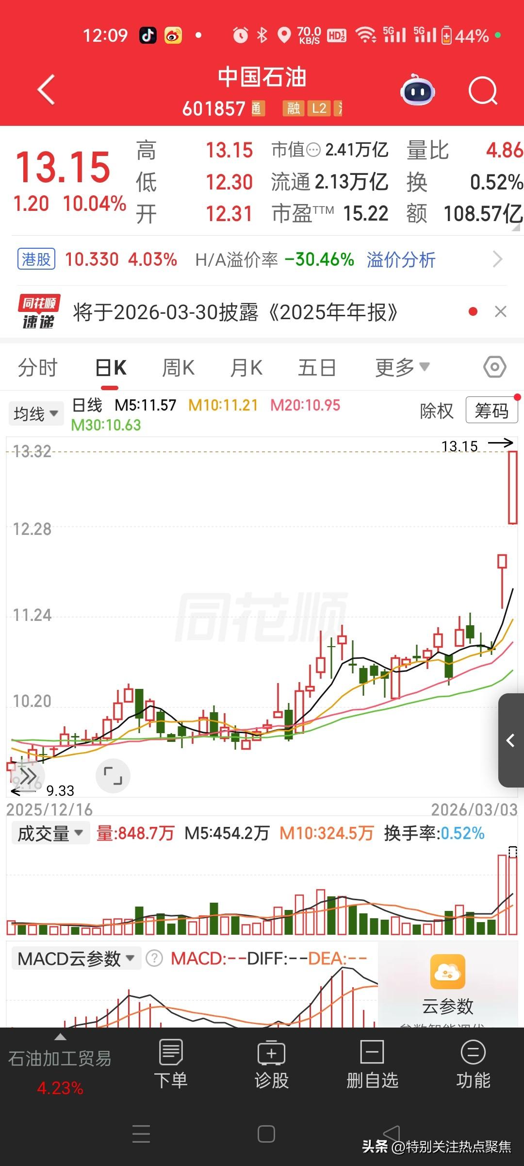 特朗普气晕了,中国三桶油历史性连续涨停!🔥 三桶油:A股历史性两连板(截至3月3日午盘) 真·两连板,不是段子 一、今日午盘(3月3日) - 中国石油(601857):13.15元,涨停(+10.04%),两连板,创11年新高 - 中国海油(600938):43.41元,涨停(+10.01%),两连板,历史新高 - 中国石化(600028):7.76元,涨停(+9.14%),两连板 二、昨日(3月2日) - 三桶油首次历史同日收盘集体涨停 - 中石油:11.95元(+10.04%) - 中石化:7.11元(+10.06%) - 海油:39.46元(+10.01%) 三、核心原因(一句话) 伊朗冲突→霍尔木兹海峡关闭→全球油气供应恐慌→国际油价暴涨→三桶油业绩预期暴增→资金疯抢 四、关键数据 - 中石油A+H总市值:2.32万亿元 - 海油A+H总市值:1.2万亿元 - 中石油上市以来仅9次涨停,这次是首次因地缘冲突连续涨停 五、风险提示 - 地缘冲突高度不确定,油价与股价波动极大 - 高溢价买入可能面临大幅回撤风险 要不要我给你整理一份三桶油两连板的关键观察指标(油价、封单、成交量、板块联动),方便你后续跟踪?