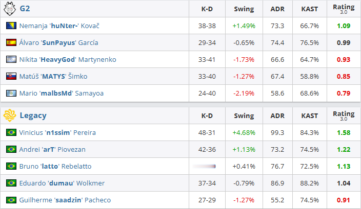 图一Legacy选择炼狱小镇,G2在下半场赢下手枪局后,一度取得9-4的领先,然而Legacy完成强起翻盘之后,开启了铁血防守的追分模式,反而率先拿到赛点,尽管G2将比赛拖入加时,但加时赛Legacy更胜一筹,以16-14先下一城。